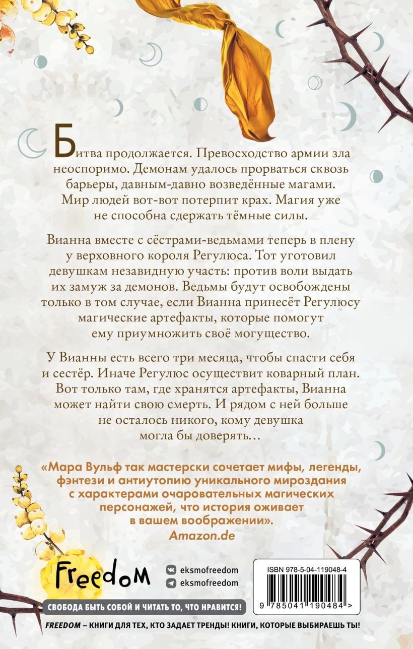 Битва продолжается. Превосходство армии зла неоспоримо. Демонам удалось прорваться сквозь барьеры, давным-давно возведенные магами. Мир людей вот-вот потерпит крах. Магия уже не способна сдержать темные силы. Вианна вместе с сестрами-ведьмами теперь в плену у верховного короля Регулюса. Тот уготовил девушкам незавидную участь: против воли выдать их замуж за демонов. Ведьмы будут освобождены только в том случае, если Вианна принесет Регулюсу магические артефакты, которые помогут ему приумножить свое могущество. У Вианны есть всего три месяца, чтобы спасти себя и сестер. Иначе Регулюс осуществит коварный план. Вот только там, где хранятся артефакты, Вианна может найти свою смерть. И рядом с ней больше не осталось никого, кому бы девушка могла доверять…