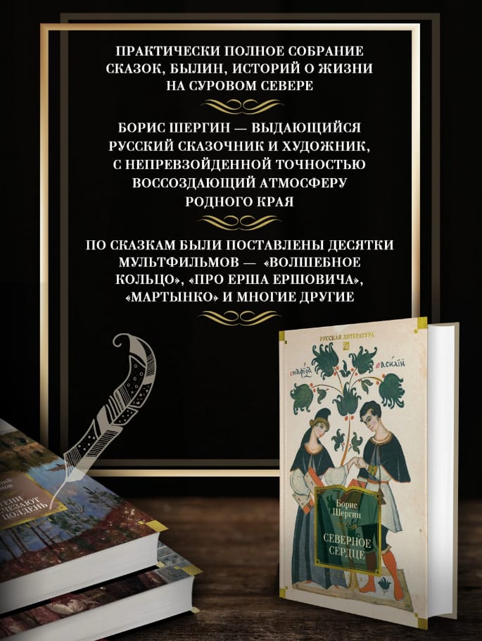 Так же мастерски, как словом, Шергин владел и кистью, виртуозно сочетая приемы северного модерна и народные мотивы Поморья. «Северное сердце» включает представительную подборку его иллюстраций, графики и набросков.