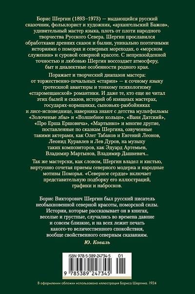 Борис Шергин (1893–1973) — выдающийся русский сказочник, фольклорист и художник, «архангельский Бажов», удивительный мастер языка, плоть от плоти народного творчества Русского Севера. Считавший себя в первую очередь «сказителем», Шергин прославился обработками древних сказок и былин, уникально поэтичными историями о поморах и северных мореходах, о «морском служении» и суровой северной красоте. С непревзойденной точностью и любовью Шергин воссоздает атмосферу, быт и диалектные особенности родного края.