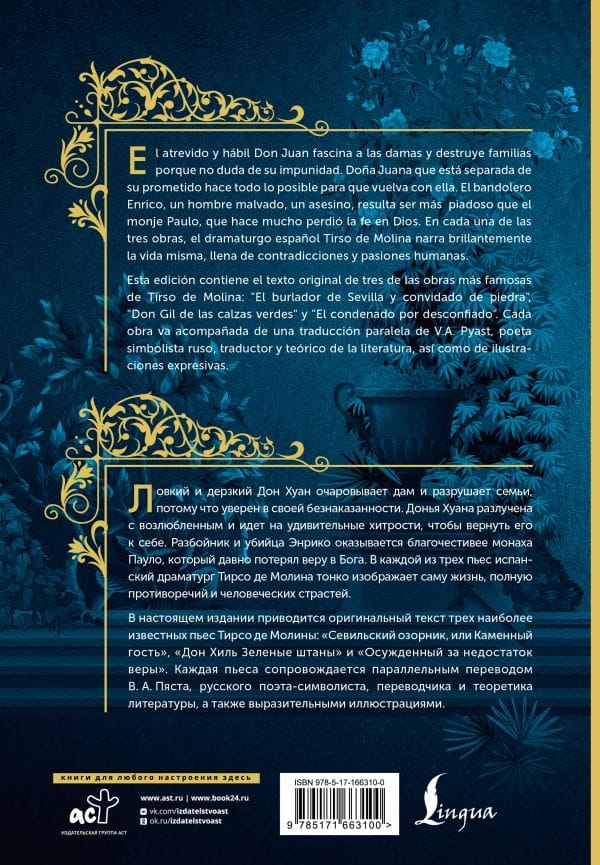 В настоящем издании приводится оригинальный текст трех наиболее известных пьес Тирсо де Молины: "Севильский озорник, или каменный гость", "Дон Хиль Зеленые штаны" и "Осужденный за недостаток веры". Каждая пьеса сопровождается параллельным переводом В. А. Пяста, русского поэта-символиста, переводчика и теоретика литературы, а также выразительными иллюстрациями.