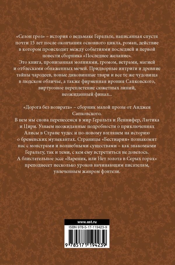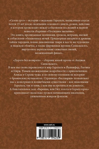 Сезон гроз – история о ведьмаке Геральте, написанная спустя почти 15 лет после окончания основного цикла, роман, действие в котором происходит между событиями последней и первой повести сборника "Последнее желание". Это книга, пронизанная молниями, громом, ветрами, магией и отблесками обнаженных мечей. Придворные интриги и древние тайны чародеев, новые диковинные твари и все те же чудовища в людском обличье, а также - фирменная ирония Сапковского, виртуозное переплетение сюжетных линий, неожиданный финал... "Дорога без возврата" – сборник малой прозы от Анджея Сапковского. В нем мы снова перенесемся в мир Геральта и Йеннифер, Лютика и Цири. Узнаем неожиданные подробности о приключениях Алисы в Стране чудес и по-новому взглянем на историю о бременских музыкантах. Страницы "Бестиария" познакомят нас с монстрами и волшебными существами – как знакомых Геральту, так и тех, с кем ему встретиться не довелось. А блистательное эссе "Вареник, или Нет золота в Серых горах" преподнесет несколько уроков начинающим писателям, увлеченным жанром фэнтези.