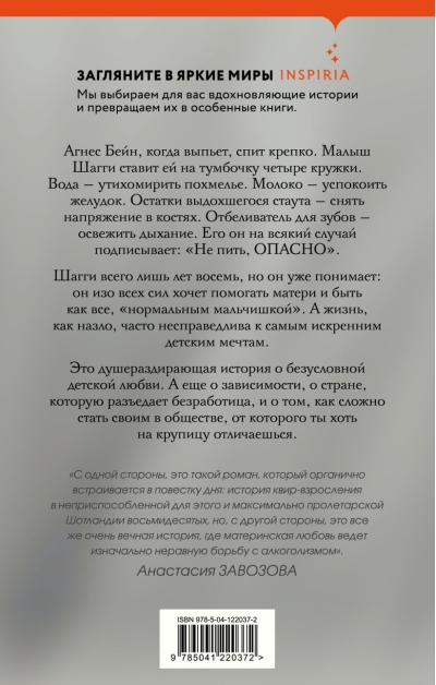 Агнес Бейн, когда выпьет, спит крепко. Малыш Шагги ставит ей на тумбочку четыре кружки. Вода — утихомирить похмелье. Молоко — успокоить желудок. Остатки выдохшегося стаута — снять напряжение в костях. Отбеливатель для зубов — освежить дыхание. Его он на всякий случай подписывает: «Не пить, ОПАСНО».
