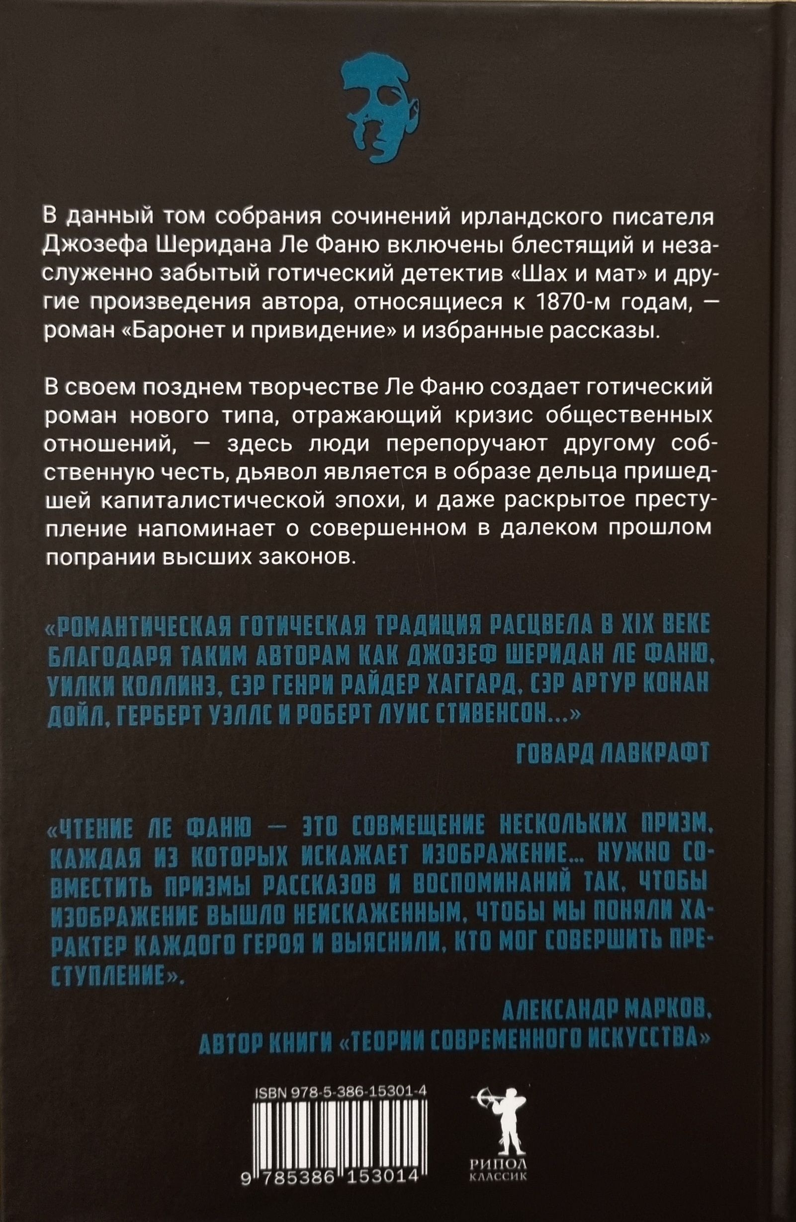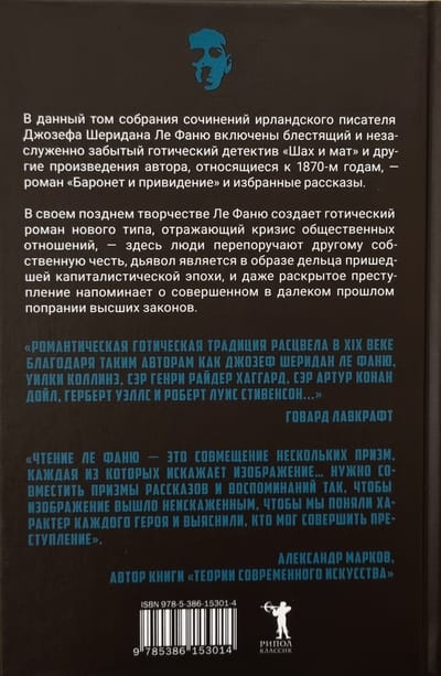 В очередной том собрания произведений ирландского писателя Джозефа Шеридана Ле Фаню включены блестящий и незаслуженно забытый готический детектив «Шах и мат» (1870) и поздние произведения автора, относящиеся к 1870-м годам: роман «Баронет и привидение» и рассказы «Белый кот из Драмганниола», «Мадам Краул и призрак», «Мертвый причетник», «Дикон-дьявол».