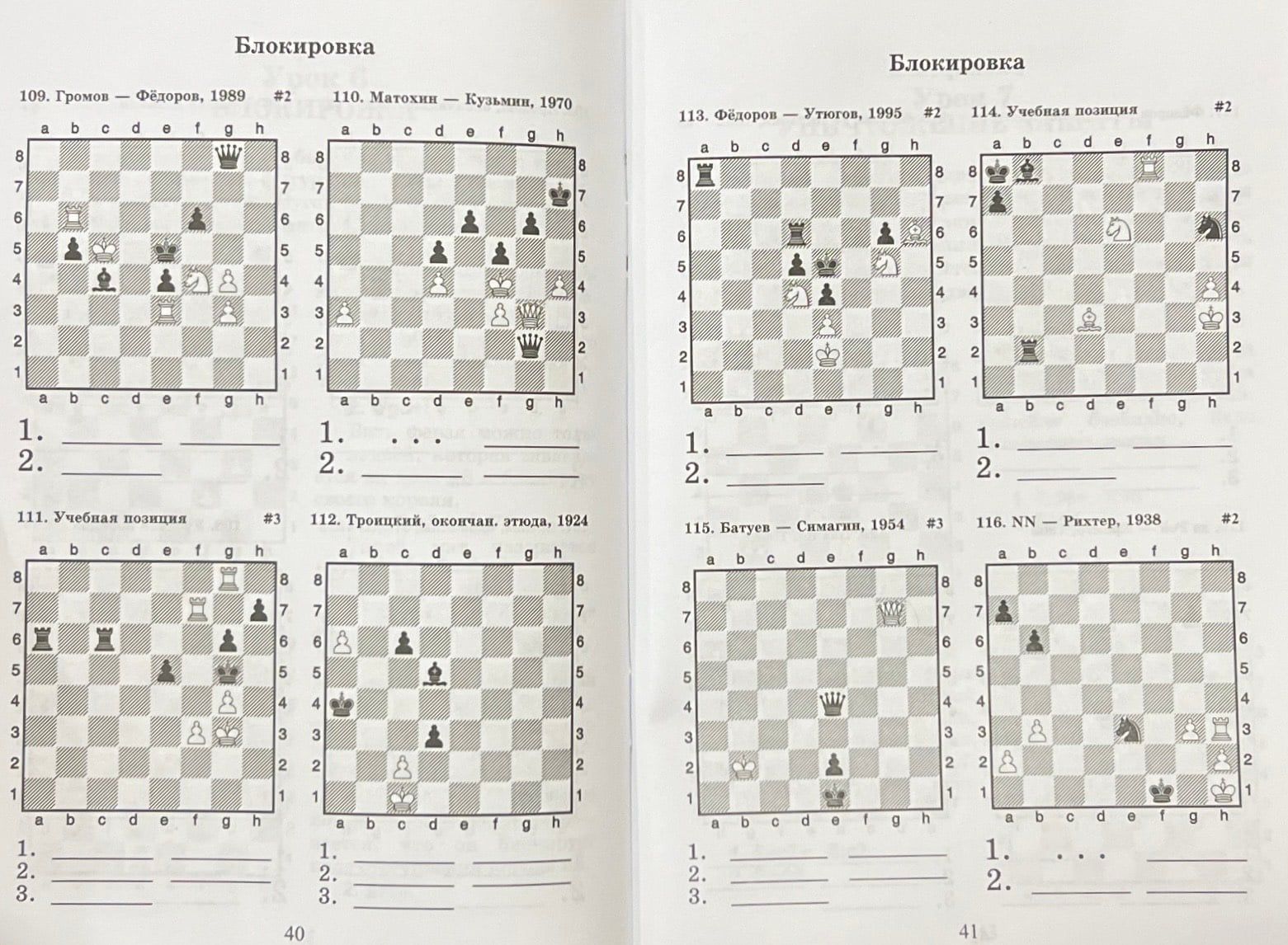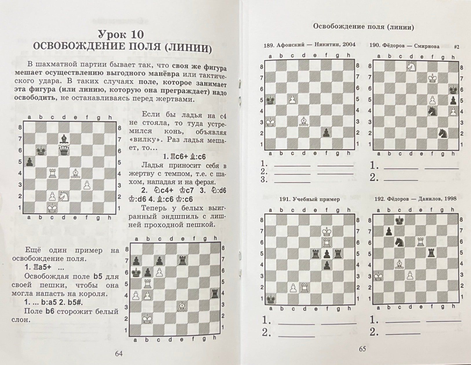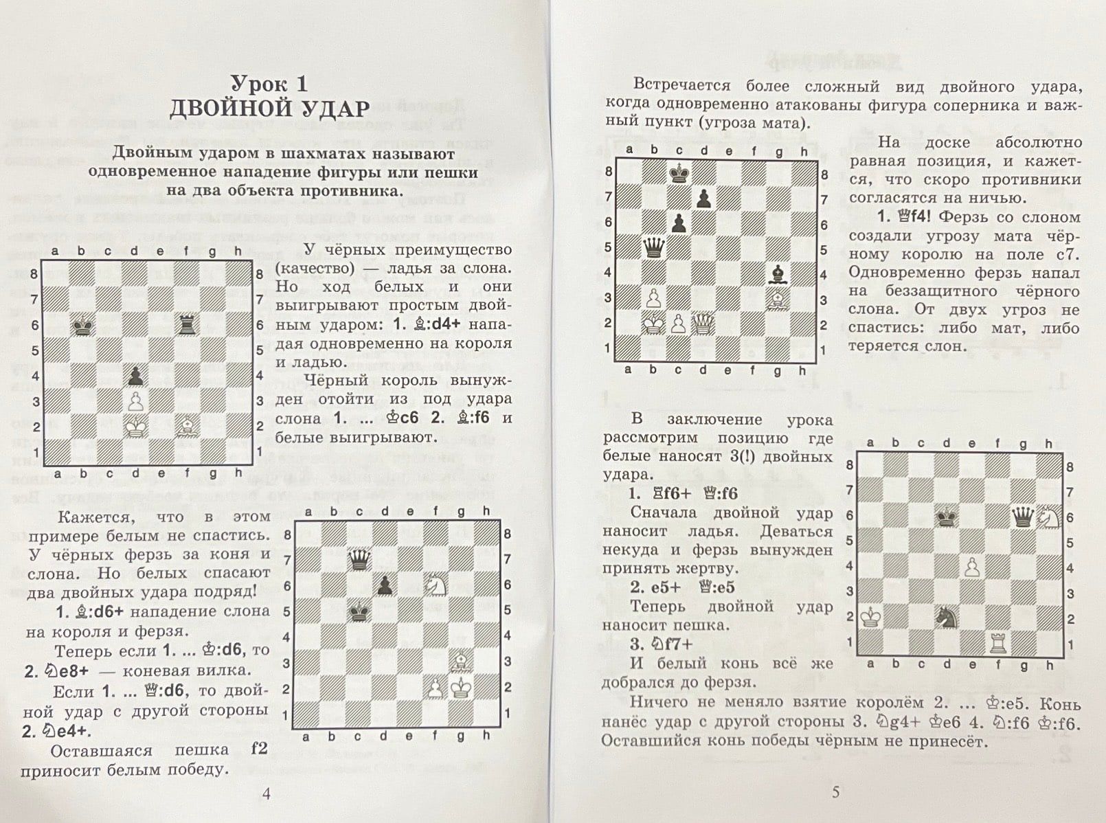 королю противника. К сожалению, в шахматной партии часто не удаётся решить дело таким образом. Книга «Е» предназначена для того, чтобы в твоём арсенале появилось как можно больше различных шахматных приёмов, которые помогут тебе одерживать победы. Твоим оружием станут и страшные двойные удары, и удушающие связки, и хитрые завлечения, и сладкие отвлечения. Ты научишься освобождать линии для разящих ударов своих дальнобойных фигур, а в случае опасности научишься перекрывать дорогу фигурам противника и проводить свои комбинации. Для достижения цели не бойся пожертвовать пару фигур противнику! Сосчитай комбинацию, и ты сумеешь с лихвой вернуть материал. С первыми задачами каждого из уроков ты легко справишься. С остальными будет чуть сложнее, но если ты увидишь на доске слабые поля, обратишь внимания на незащищённые фигуры противника, стеснённое положение его короля, то решишь любую задачу.