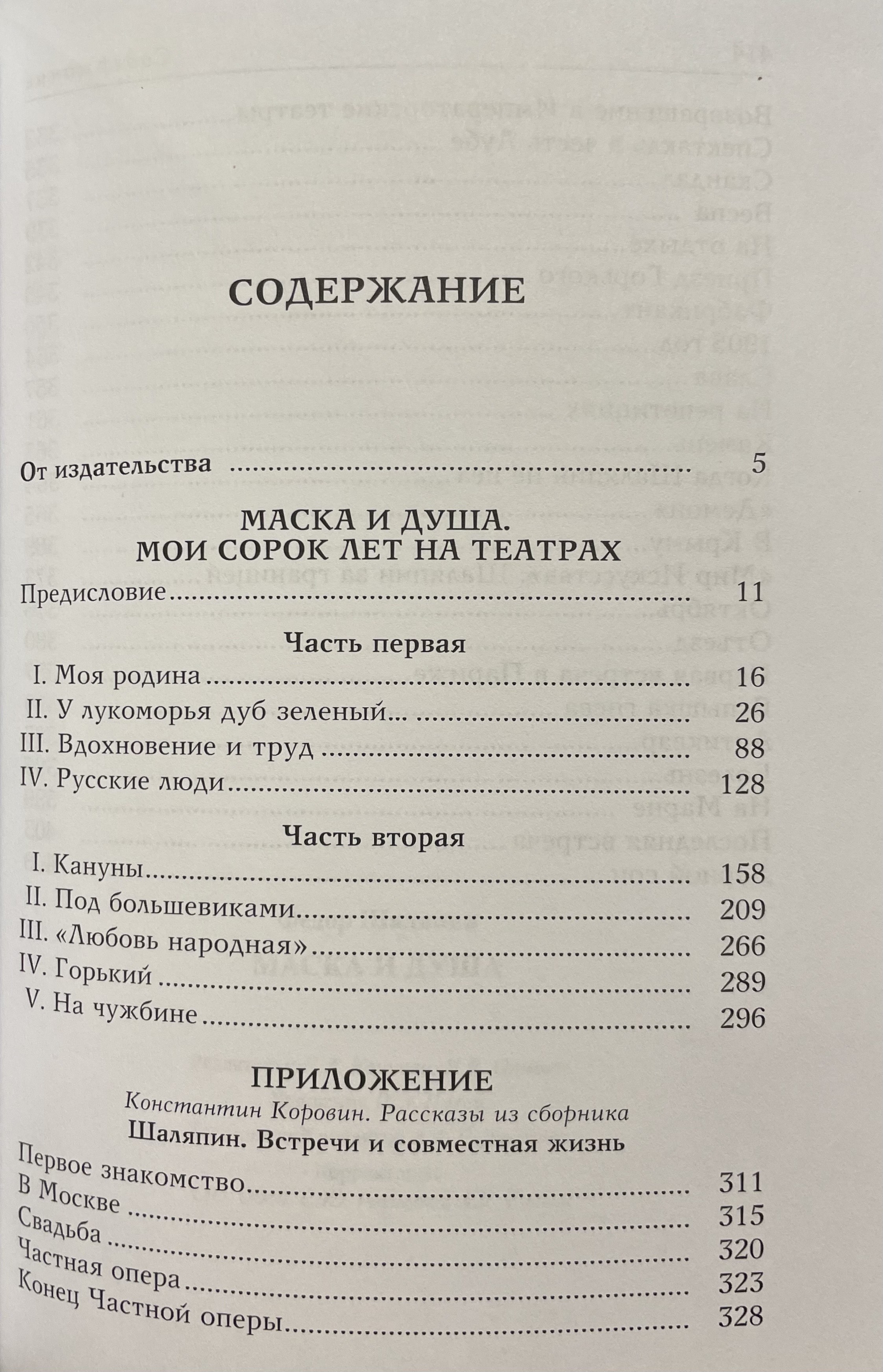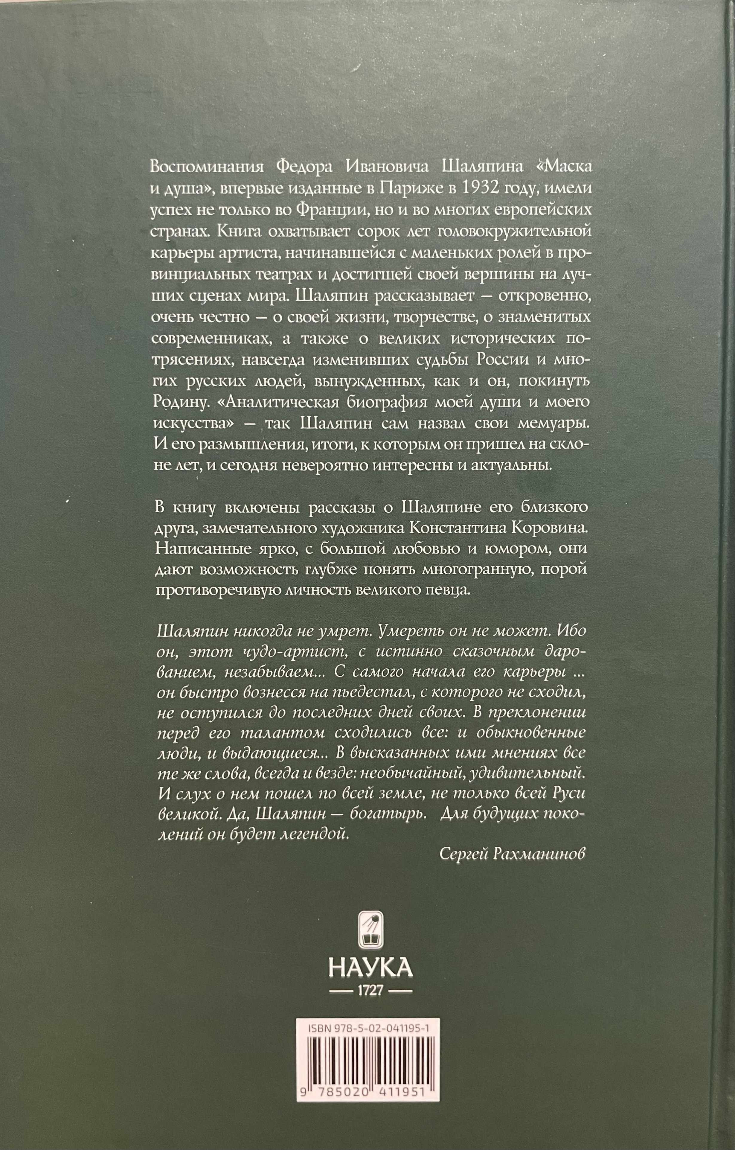 Книга воспоминаний «Маска и душа» была написана Ф.И. Шаляпиным в эмиграции и впервые вышла в свет в Париже в 1932 году, вызвав живой интерес во всем мире. Шаляпин повествует о событиях своей жизни, о знаменитых современниках, о социальных потрясениях начала ХХ века и Октябрьской революции, которая подтолкнула его к решению навсегда покинуть Россию. В книгу также включены рассказы художника Константина Алексеевича Коровина о знакомстве и дружбе с Шаляпиным, опубликованные через год после смерти артиста.