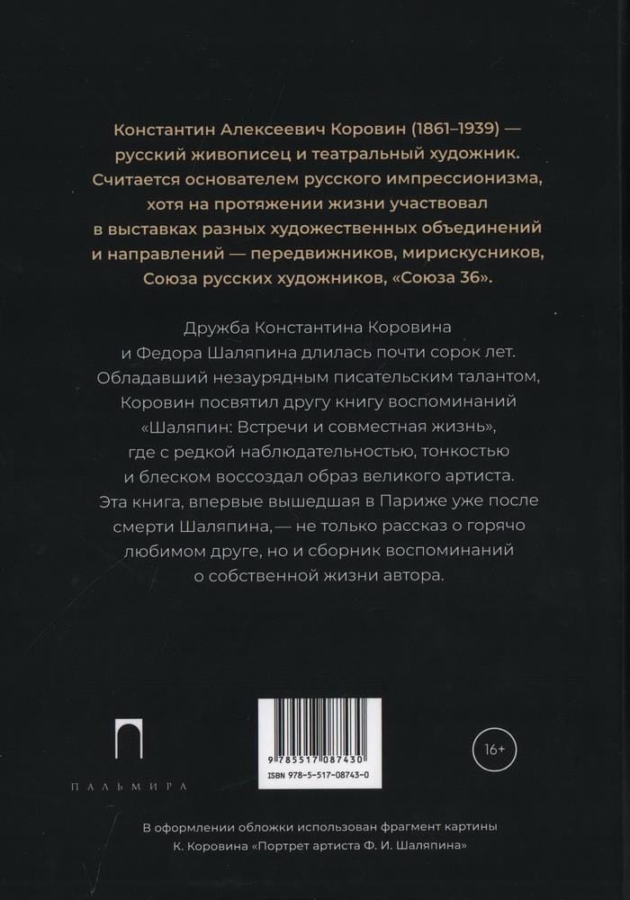 Дружба Константина Коровина и Федора Шаляпина длилась почти сорок лет. Обладавший незаурядным писательским талантом, Коровин посвятил своему доброму знакомому книгу воспоминаний «‎Шаляпин. Встречи и совместная жизнь»‎, где с редкой наблюдательностью, тонкостью и блеском воссоздал образ великого артиста. Эта книга, впервые вышедшая в Париже уже после смерти Шаляпина, - не только рассказ о горячо любимом друге, но и сборник воспоминаний о собственной жизни автора.