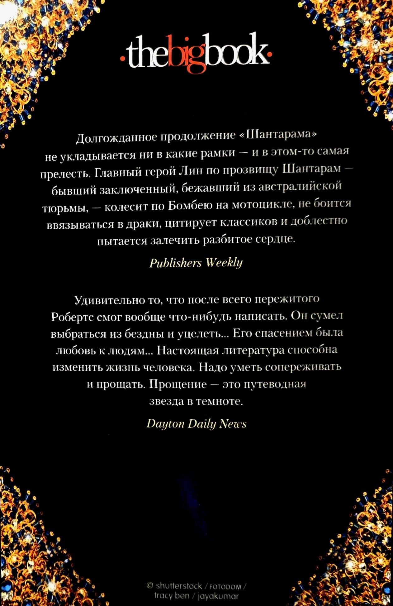 И вот наконец Г. Д. Робертс написал продолжение истории Лина по прозвищу Шантарам, бежавшего из австралийской тюрьмы строгого режима и ставшего в Бомбее фальшивомонетчиком и контрабандистом.