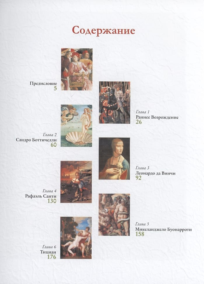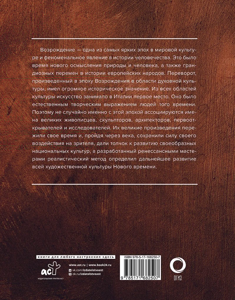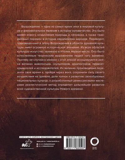 Возрождение – одна из самых ярких и изменивших мировоззрение людей эпох в мировой культуре и феноменальное явление в истории человечества. Это было время нового осмысления природы и человека и грандиозных перемен в истории европейских народов. Переворот, произведенный в эпоху Возрождения в области духовной культуры, имел огромное историческое значение. Из всех областей культуры искусство занимало в Италии первое место. Оно было естественным творческим выражением людей того времени. Поэтому не случайно именно с этой эпохой ассоциируются имена великих живописцев, скульпторов, архитекторов, первооткрывателей и исследователей. Их великие произведения пережили свое время и, пройдя через века, сохранили силу своего воздействия на зрителя, дали толчок к развитию своеобразных национальных культур, а разработанный ренессансными мастерами реалистический метод определил дальнейшее развитие всей художественной культуры Нового времени. С какими великими мастерами живописи, скульптуры и архитектуры неразрывно связано Возрождение? Кто из художников подготовил появление Возрождения? Как складывалась судьба великих титанов Возрождения? В этом прекрасно иллюстрированном издании вы найдете ответы на эти, и многие другие вопросы.