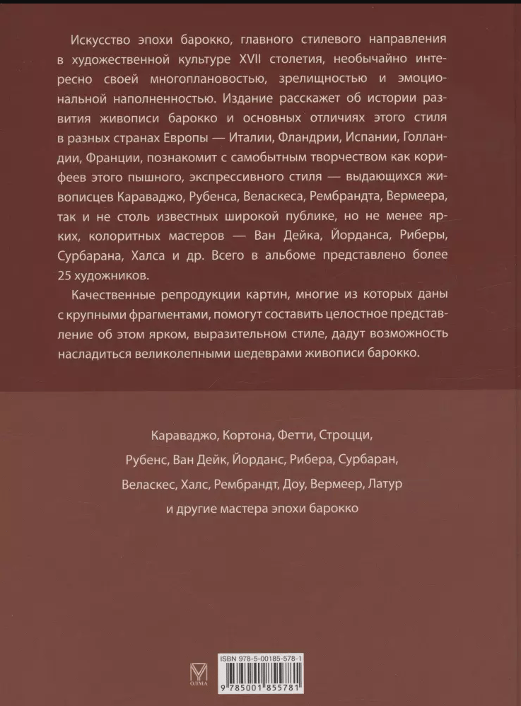 Искусство эпохи барокко, главного стилевого направления в художественной культуре XVII столетия, необычайно интересно своей многоплановостью, зрелищностью и эмоциональной наполненностью. Издание расскажет об истории развития живописи барокко и основных отличиях этого стиля в разных странах Европы — Италии, Фландрии, Испании, Голландии, Франции, познакомит с самобытным творчеством как корифеев этого пышного, экспрессивного стиля — выдающихся живописцев Караваджо, Рубенса, Веласкеса, Рембрандта, Вермеера, так и не столь известных широкой публике, но не менее ярких, колоритных мастеров — Ван Дейка, Йорданса, Риберы, Сурбарана, Халса и др. Всего в альбоме представлено более 25 художников.