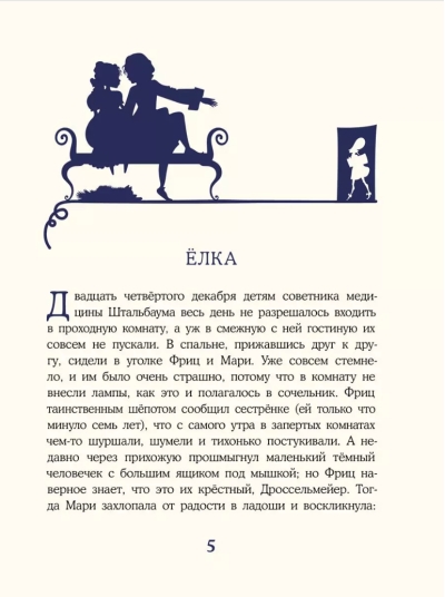 Цветные и силуэтные иллюстрации Надежды Фроловой и классический перевод Ирины Татариновой подарят читателю праздничное настроение и помогут погрузиться в чудесный мир одной из самых известных в мире новогодних сказок, которую пару столетий назад написал немецкий романтик Э.Т.А. Гофман.