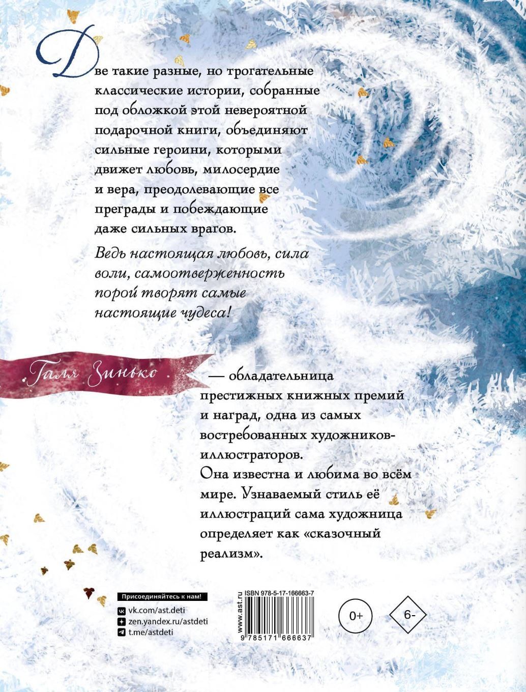 Две такие разные, но трогательные классические истории, собранные под обложкой этой невероятной подарочной книги, объединяют сильные героини, которыми движет любовь, милосердие и вера, преодолевающие все преграды и побеждающие даже сильных врагов. Ведь настоящая любовь, сила воли, самоотверженность порой творят самые настоящие чудеса! Галя Зинько — обладательница престижных книжных премий и наград, одна из самых востребованных художников-иллюстраторов. Она известна и любима во всем мире. Узнаваемый стиль её иллюстраций сама художница определяет как «сказочный реализм».