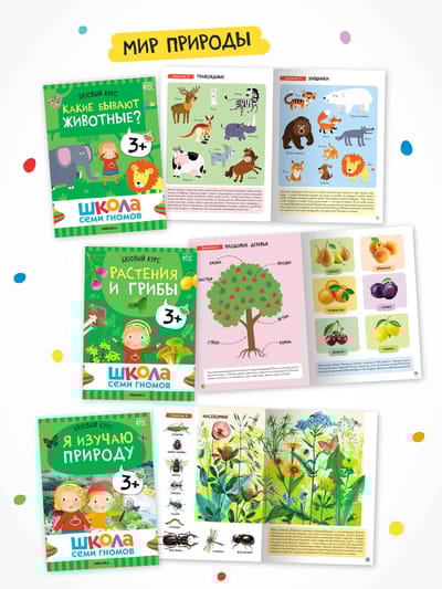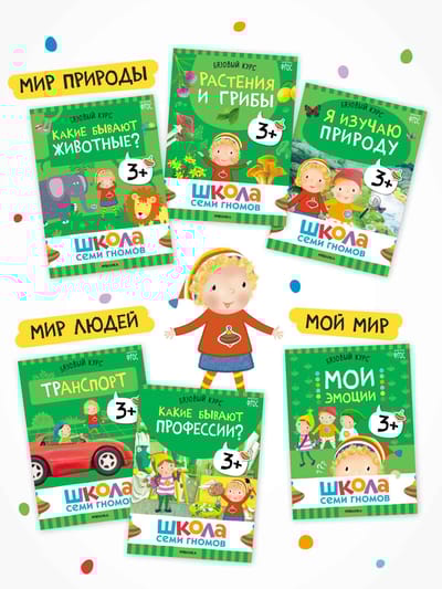 Школа Семи Гномов – это система, а не набор книг. Комплекс из 12 книг направлен на всестороннее развитие ребенка. 6 книг для развития когнитивных способностей: познавательный интерес, умение думать, анализировать, делать выводы. И еще 6 книг для на знакомства с окружающим миром, его закономерностями и взаимосвязями.
