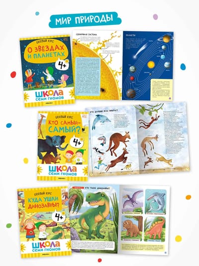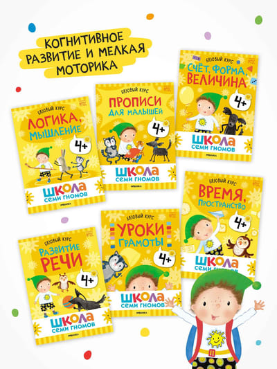 Школа Семи Гномов – это система, а не набор книг. Комплекс из 12 книг направлен на всестороннее развитие ребенка. 6 книг для развития когнитивных способностей: познавательный интерес, умение думать, анализировать, делать выводы. И еще 6 книг для на знакомства с окружающим миром, его закономерностями и взаимосвязями.