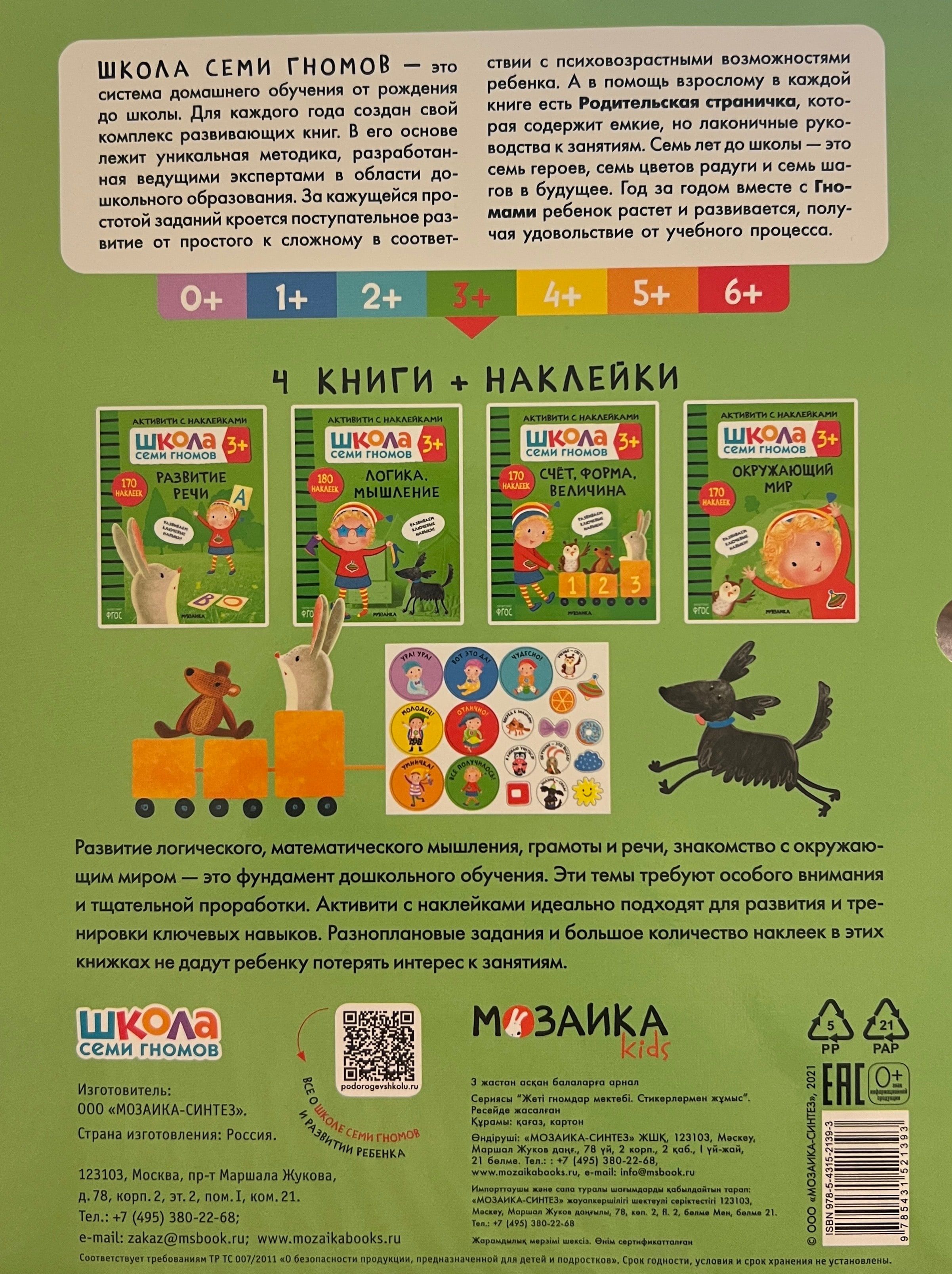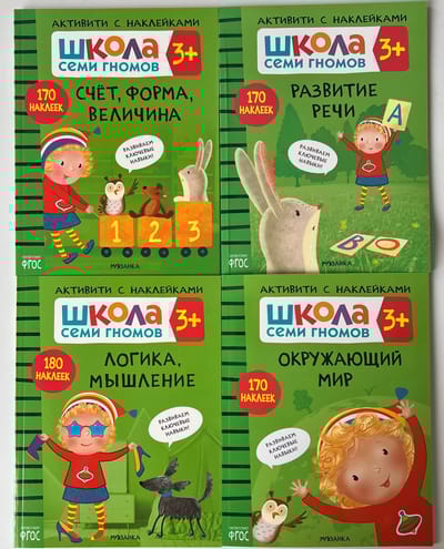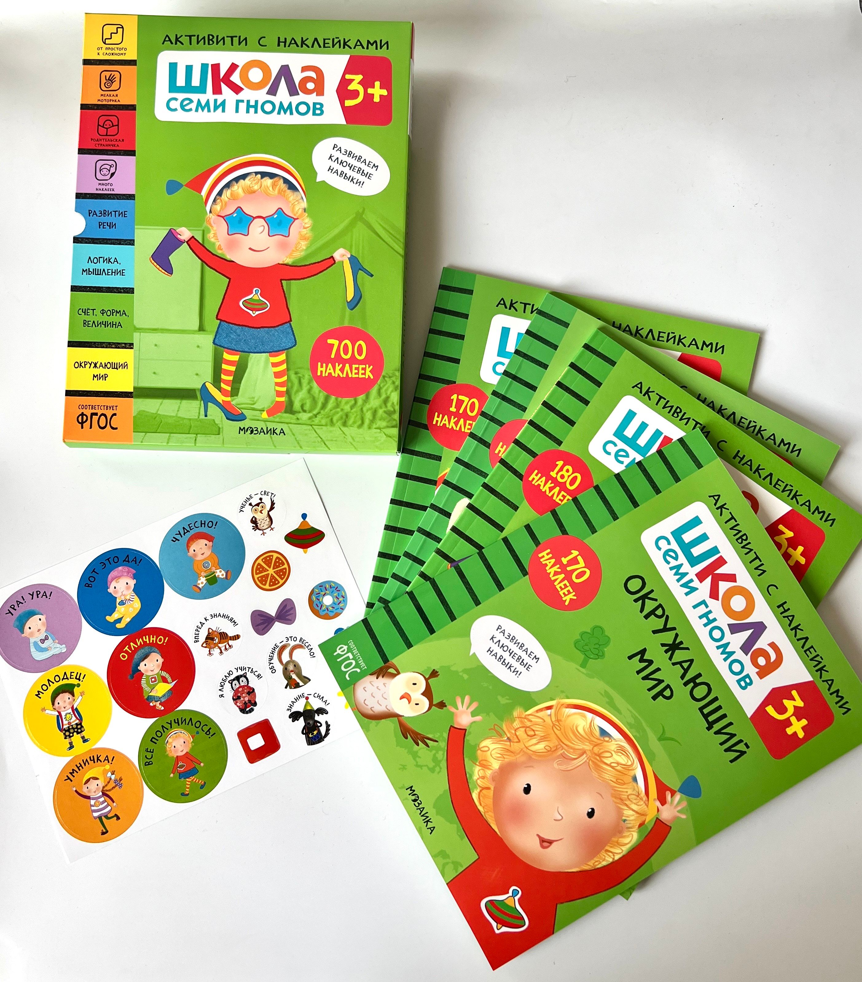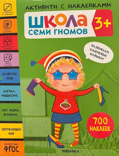 Серия «Школа Семи Гномов. Активити с наклейками» — занимательное дополнение к базовому курсу «Школа Семи Гномов», предназначенное для развития дошкольников в ключевых областях обучения. Развивая логическое мышление, грамоту и речь, дети получают прочный фундамент для будущего обучения. Специально разработанные обучающие задания и игры в наборе стимулируют внимание, развивают мелкую моторику и учат решению различных задач.