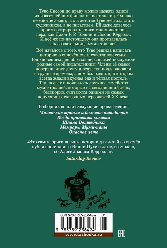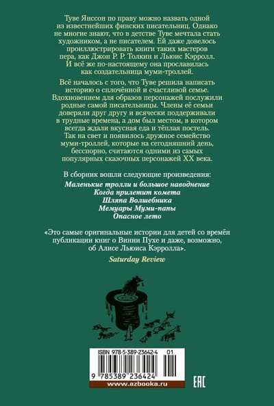 В маленькой долине на зелёном лугу стоит удивительный дом, выкрашенный голубой краской. В этом доме живёт семейство муми-троллей: Муми-мама, Муми-папа и сам Муми-тролль. И если в один прекрасный день на пороге объявится большая компания, здесь всем найдётся место. Вообще-то, вокруг много всего непонятного и опасного — стихийные бедствия, волшебные шляпы, муравьиные львы… Но муми-троллей, снорков, Сниффа, Снусмумрика и их друзей это вовсе не пугает. Они путешествуют, размышляют о нужности и ненужности всего сущего, пишут книги и ищут сокровища. Ведь какие бы приключения ни ожидали Муми-тролля и его друзей, они знают: даже если в их долину упадёт комета, даже если случится наводнение или начнётся буря, лес, сад и дом останутся на месте. На веранде всегда можно будет выпить чашечку кофе и полакомиться печеньем или тортом, который испекла Муми-мама… Папа с мамой всё уладят, только нужно вовремя вернуться домой!..Сегодня муми-тролли, бесспорно, считаются одними из самых популярных сказочных персонажей ХХ века. И это неудивительно. Очаровательные в своей необычности, похожие на плюшевые игрушки, добрые и всегда готовые прийти на помощь существа покоряли сердце любого, кто решался узнать их поближе. Обитатели Муми-долины так полюбились во всём мире, что книги о них были переведены на более чем 50 языков, а количество снятых мультфильмов уже перевалило за десяток. Также в их честь открыли музей и два тематических парка.