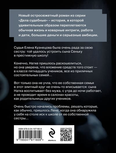 Судья Елена Кузнецова была очень рада за свою сестру: той удалось устроить сына Сеньку в престижную школу. Конечно, Натке пришлось раскошелиться, но она уверена, что вложение средств того стоит — в классе пятнадцать учеников, все из приличных состоятельных семей… Вот только она не учла, что ее собственная семья в этот элитный круг не очень-то вписывается: сына Натка воспитывает без мужа, с утра до ночи работает, а не проводит время в салонах красоты. Очень быстро начались проблемы, решать которые, как обычно, пришлось Лене …