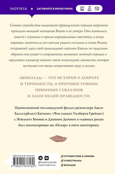 «Шоколад» — это история о доброте и терпимости, о противостоянии невинных соблазнов и закоснелой праведности. Одноименный голливудский фильм режиссера Лассе Халлстрёма (с Жюльет Бинош и Джонни Деппом в главных ролях) был номинирован на «Оскар» в пяти категориях.