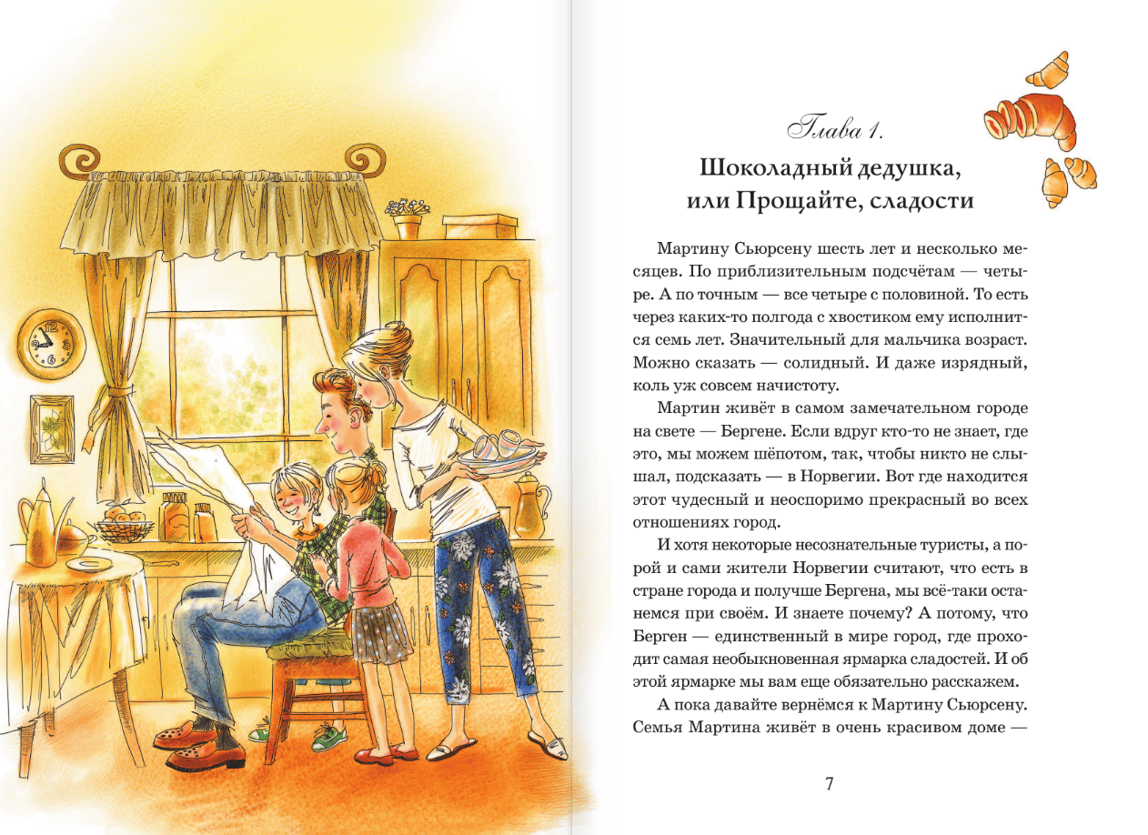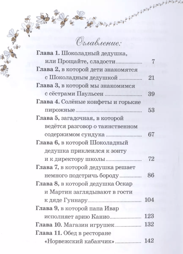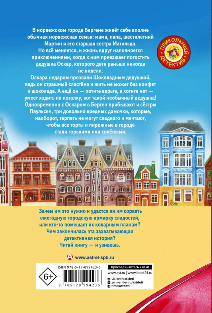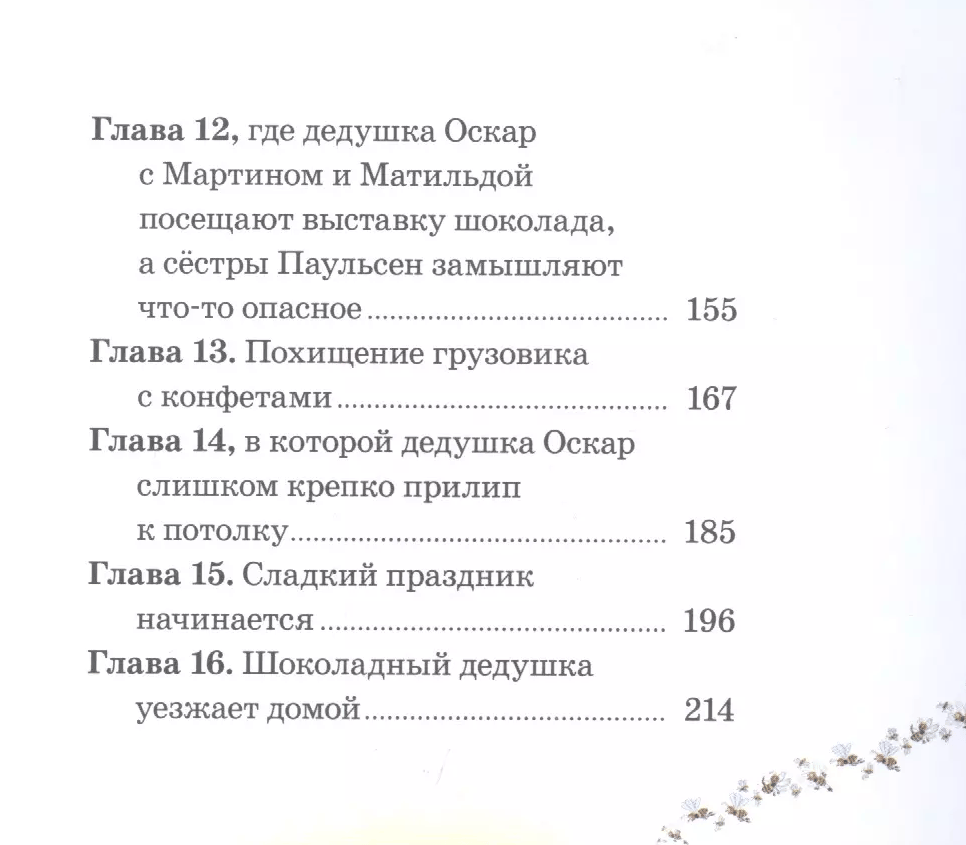 В норвежском городе Бергене живёт себе вполне обычная норвежская семья: мама, папа, шестилетний Мартин и его старшая сестра Матильда. Но всё меняется, и жизнь вдруг наполняется приключениями, когда к ним приезжает погостить дедушка Оскар, которого дети раньше никогда не видели. Оскара недаром прозвали Шоколадным дедушкой, ведь он страшный сластёна и жить не может без конфет и шоколада. А ещё он — хотите верьте, а хотите нет — умеет ходить по потолку, вот такой необычный дедушка! Одновременно с Оскаром в Берген прибывают и сёстры Паульсен, три довольно вредных дамочки, которые, наоборот, терпеть не могут сладкого и мечтают, чтобы все торты и пирожные в городе стали горькими или солёными. Зачем им это нужно и удастся ли им сорвать ежегодную городскую ярмарку сладостей, или кто-то помешает их коварным планам? Чем закончилась эта захватывающая детективная история? Читай книгу — и узнаешь.