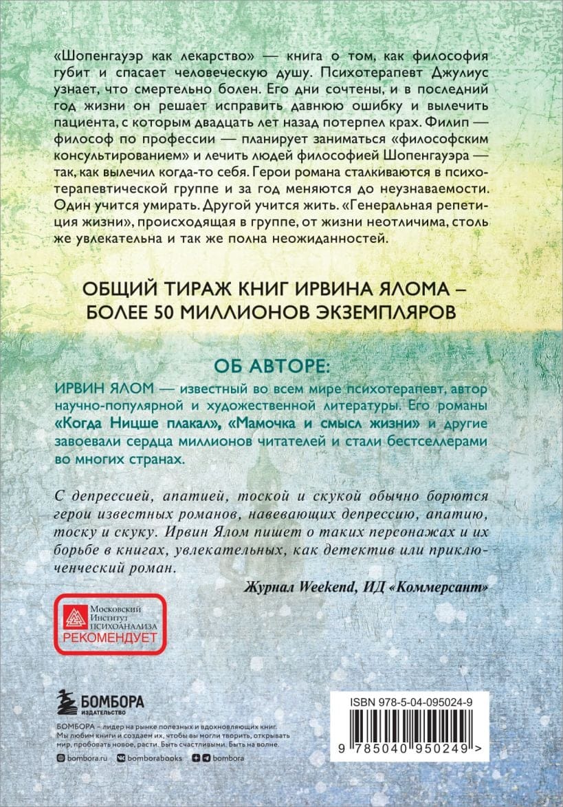 Опытный психотерапевт Джулиус узнаёт, что смертельно болен. Его дни сочтены, и в последний год жизни он решает исправить давнюю ошибку и вылечить пациента, с которым двадцать лет назад потерпел крах. Филип — философ по профессии и мизантроп по призванию, планирует заниматься «философским консультированием» и лечить людей философией Шопенгауэра — так, как вылечил когда-то себя. Эти двое сталкиваются в психотерапевтической группе и за год меняются до неузнаваемости. Один учится умирать. Другой учится жить. «Генеральная репетиция жизни», происходящая в группе, от жизни неотличима, столь же увлекательна и так же полна неожиданностей.
