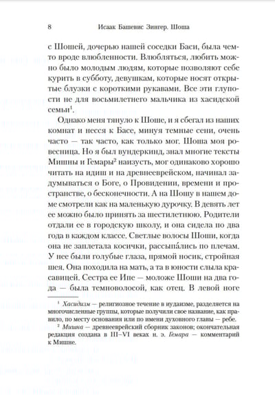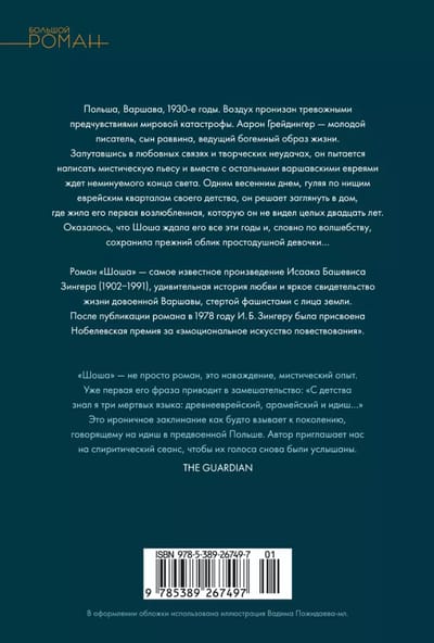 Польша, Варшава, 1930-е годы. Воздух пронизан тревожными предчувствиями мировой катастрофы. Аарон Грейдингер — молодой писатель, сын раввина, ведущий богемный образ жизни. Запутавшись в любовных связях и творческих неудачах, он пытается написать мистическую пьесу и вместе с остальными варшавскими евреями ждет неминуемого конца света. Одним весенним днем, гуляя по нищим еврейским кварталам своего детства, он решает заглянуть в дом, где жила его первая возлюбленная, которую он не видел целых двадцать лет. Оказалось, что Шоша ждала его все эти годы и, словно по волшебству, сохранила прежний облик простодушной девочки… Роман «Шоша» — самое известное произведение Исаака Башевиса Зингера (1902—1991), удивительная история любви и яркое свидетельство жизни довоенной Варшавы, стертой фашистами с лица земли. После публикации английской версии романа в 1978 году И. Б. Зингеру была присвоена Нобелевская премия за «эмоциональное искусство повествования». Первоначально текст выходил на идиш под названием «Экспедиции души», однако в процессе перевода на английский был значительно изменен и переработан автором, который в дальнейшем настаивал, чтобы именно по английской версии совершались переводы на другие языки. В настоящем издании роман «Шоша» представлен в классическом переводе с английского Нины Брумберг.