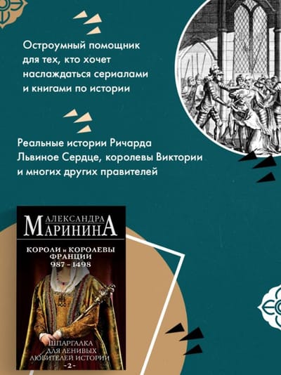 Новая историческая «шпаргалка» от Александры Марининой. На этот раз – французская. Париж, Версаль, блистательные короли, дерзкие королевы, изящные фрейлины и смелые мушкетёры… Ну кто из нас с детства не был очарован Францией и ее историей! C особым «марининским» юмором в книге рассказывается история французских королей начиная с Гуго Капета, основателя династии Капетингов до Карла Восьмого из династии Валуа. Вы узнаете что это были за люди, с какими талантами и недостатками, какими надеждами и мечтами они жили.