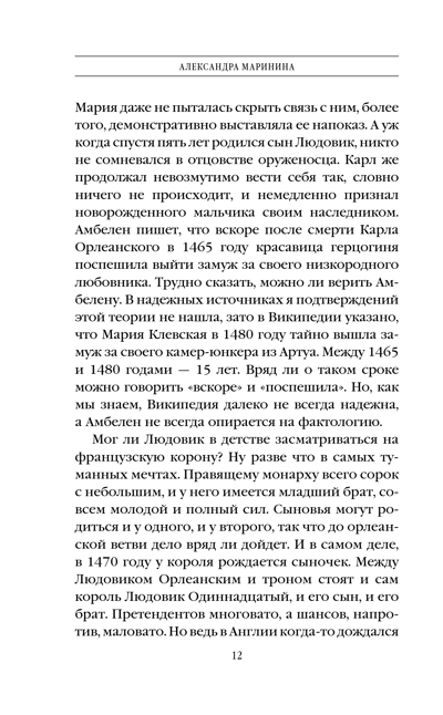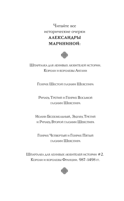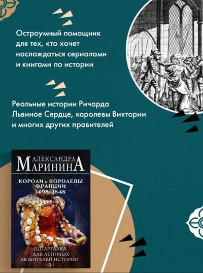 Новая историческая «шпаргалка» от Александры Марининой. На этот раз — французская. Париж, Версаль, блистательные короли, дерзкие королевы, изящные фрейлины и смелые мушкетёры… Ну кто из нас с детства не был очарован Францией и её историей! C особым «марининским» юмором в книге рассказывается история французских королей от Отца народа Людовика Двенадцатого до Луи-Филиппа Первого. Вы узнаете, что это были за люди, с какими талантами и недостатками, какими надеждами и мечтами они жили.