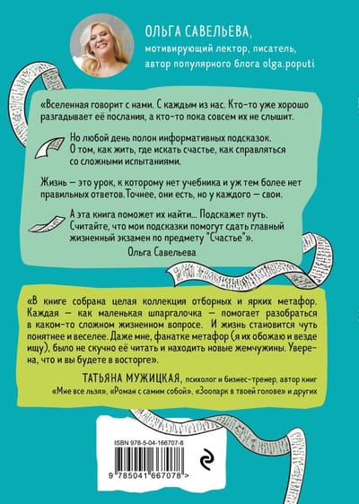 В новой книге Ольга с радостью делится с читателями теми жизненными ребусами, которые разгадала сама. Для этого она выбрала самые яркие, самые наглядные метафоры. Те, которые точно заставят задуматься и непременно помогут разгадать самые сложные жизненные задачи. Считайте, что это шпаргалка, которая поможет сдать главный жизненный экзамен по предмету "Счастье". Подсмотрите в неё, если запутались.