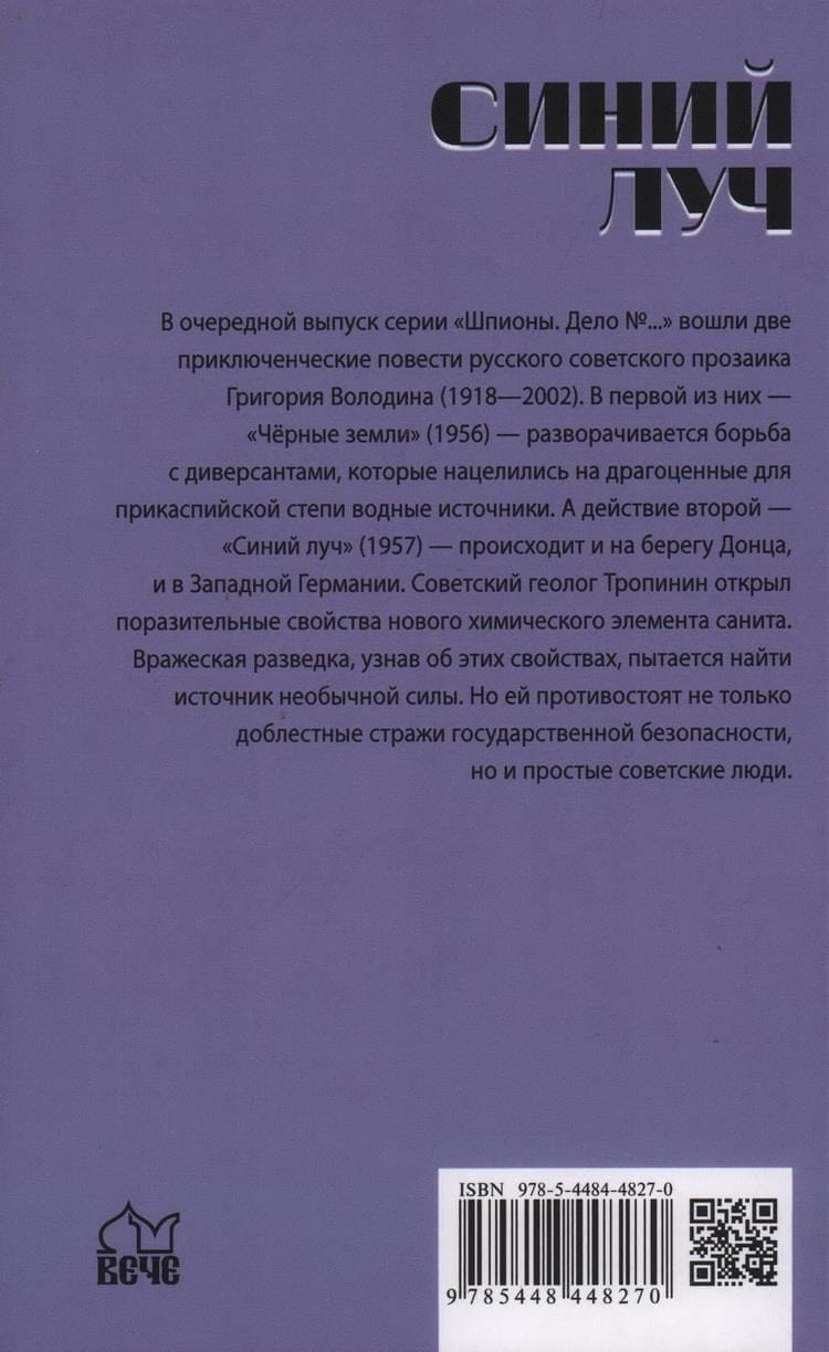 В очередной выпуск серии «Шпионы. Дело №...» вошли две приключенческие повести русского советского прозаика Григория Володина (1918—2002). В первой из них — «Чёрные земли» (1956) — разворачивается борьба с диверсантами, которые нацелились на драгоценные для прикаспийской степи водные источники. А действие второй — «Синий луч» (1957) — происходит и на берегу Донца, и в Западной Германии. Советский геолог Тропинин открыл поразительные свойства нового химического элемента санита. Вражеская разведка, узнав об этих свойствах, пытается найти источник необычной силы. Но ей противостоят не только доблестные стражи государственной безопасности, но и простые советские люди.