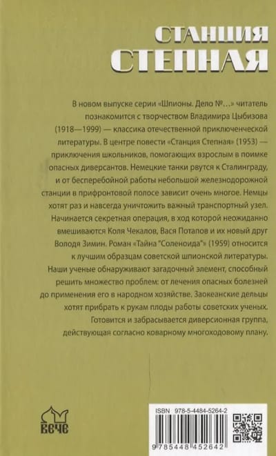 В новом выпуске серии «Шпионы. Дело №…» читатель познакомится с творчеством Владимира Цыбизова (1918-1999) - классика отечественной приключенческой литературы. В центре повести «Станция Степная» (1953) - приключения школьников, помогающих взрослым в поимке опасных диверсантов. Немецкие танки рвутся к Сталинграду, и от бесперебойной работы небольшой железнодорожной станции в прифронтовой полосе зависит очень многое. Немцы хотят раз и навсегда уничтожить важный транспортный узел. Начинается секретная операция, в ход которой неожиданно вмешиваются Коля Чекалов, Вася Потапов и их новый друг Володя Зимин.