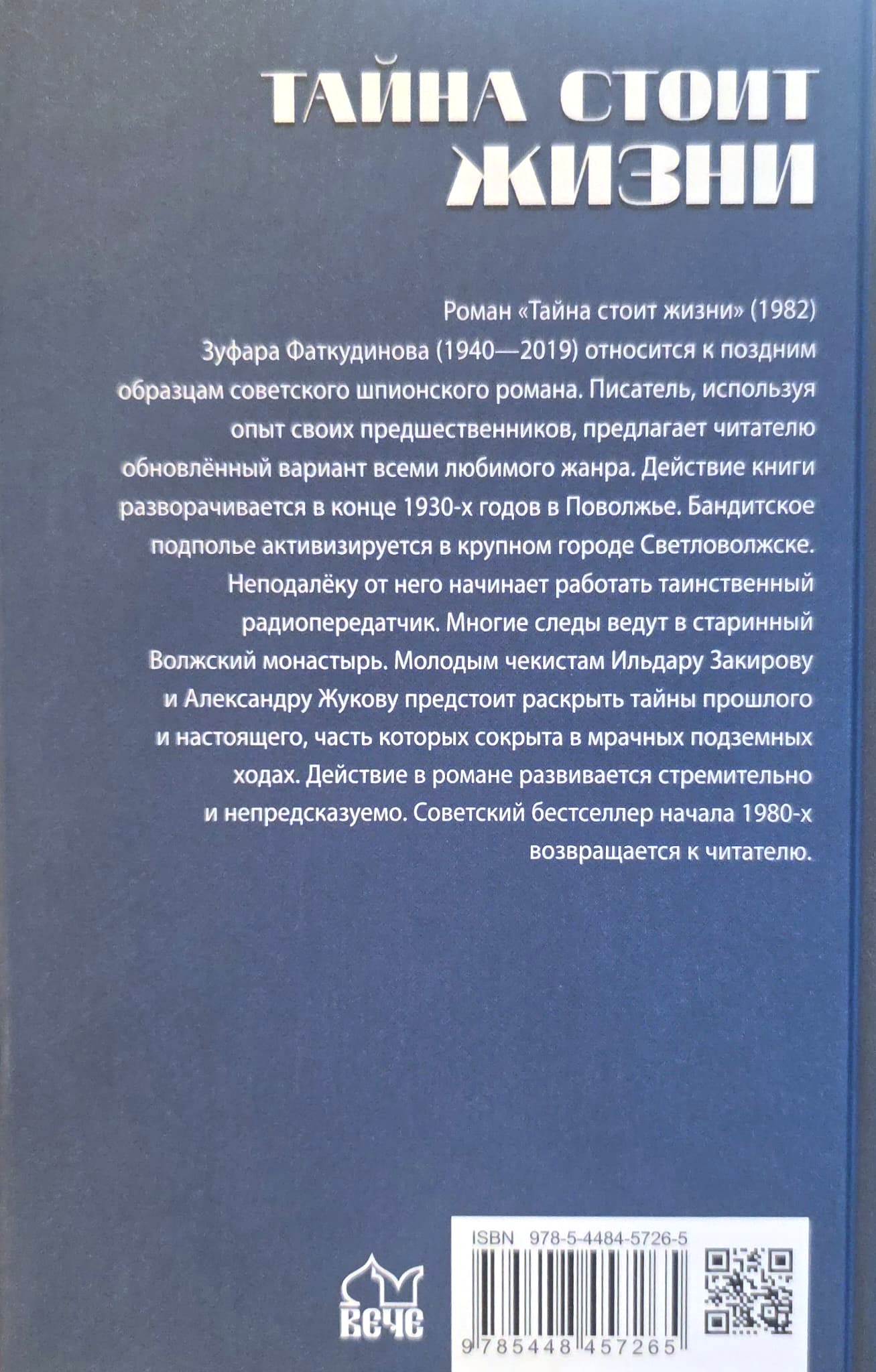 Роман «Тайна стоит жизни» Зуфара Фаткудинова относится к поздним образцам советского шпионского романа. Писатель, используя опыт своих предшественников, предлагает читателю обновлённый вариант всеми любимого жанра. Действие книги разворачивается в конце 1930‑х годов в Поволжье. Бандитское подполье активизируется в крупном городе Светловолжске. Неподалеку от него начинает работать таинственный радиопередатчик. Многие следы ведут в старинный Волжский монастырь. Молодым чекистам Ильдару Закирову и Александру Жукову предстоит раскрыть тайны прошлого и настоящего, часть которых сокрыта в мрачных подземных ходах. Действие в романе развивается стремительно и непредсказуемо. Советский бестселлер начала 1980‑х возвращается к читателю.