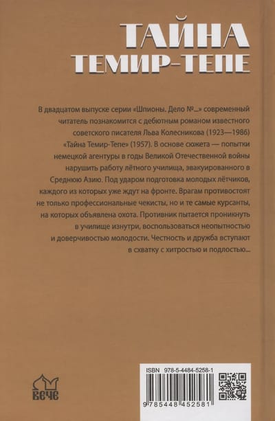 В двадцатом выпуске серии «Шпионы. Дело №...» современный читатель познакомится с дебютным романом известного советского писателя Льва Колесникова (1923—1986) «Тайна Темир-Тепе» (1957). В основе сюжета — попытки немецкой агентуры в годы Великой Отечественной войны нарушить работу летного училища, эвакуированного в Среднюю Азию. Под ударом подготовка молодых лётчиков, каждого из которых уже ждут на фронте. Врагам противостоят не только профессиональные чекисты, но и те самые курсанты, на которых объявлена охота. Противник пытается проникнуть в училище изнутри, воспользоваться неопытностью и доверчивостью молодости. Честность и дружба вступают в схватку с хитростью и подлостью...