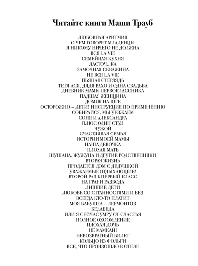 Суматошный, яркий город. Люди, которые через минуту после знакомства считают тебя близким. Такую жизнь никто не опишет так, как Маша Трауб, чьи книги похожи на всеми любимые комедии Георгия Данелии — над ними плачешь и смеешься, испытываешь восторг и сочувствие. Это как раз то, что мы ищем в книге: возможность пережить всю палитру чувств.
