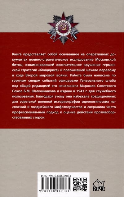 Книга представляет собой основанное на оперативных документах военно-стратегическое исследование Московской битвы, ознаменовавшей окончательное крушение германской стратегии «блицкрига» и положившей начало перелому в ходе Второй мировой войны. Работа была написана по горячим следам событий офицерами Генерального штаба под общей редакцией его начальника Маршала Советского Союза Б.М. Шапошникова и издана в 1943 г. для служебного пользования. Благодаря этому она избежала традиционных для советской военной историографии идеологических наслоений и позднейшего мифотворчества и сохранила чисто профессиональный подход к оценке действий противоборствовавших сторон.