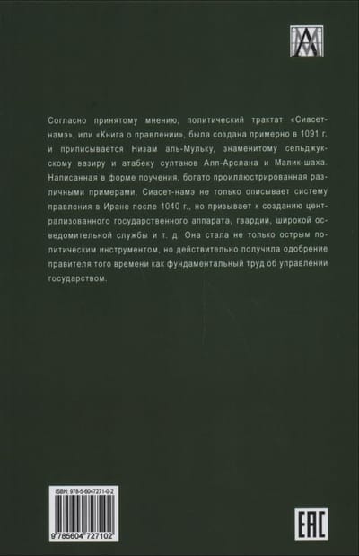 Согласно принятому мнению, политический трактат «Сиасет-намэ», или «Книга о правлении», была создана примерно в 1091 г. и приписывается Низам аль-Мульку, знаменитому сельджукскому вазиру и атабеку султанов Алп-Арслана и Малик-шаха. Написанная в форме поучения, богато проиллюстрированная различными примерами, Сиасет-намэ не только описывает систему правления в Иране после 1040 г., но призывает к созданию централизованного государственного аппарата, гвардии, широкой осведомительной службы и т. д. Она стала не только острым политическим инструментом, но действительно получила одобрение правителя того времени как фундаментальный труд об управлении государством. Книга адресована историкам, политологам и всем, кто интересуется дидактической прозой Востока.