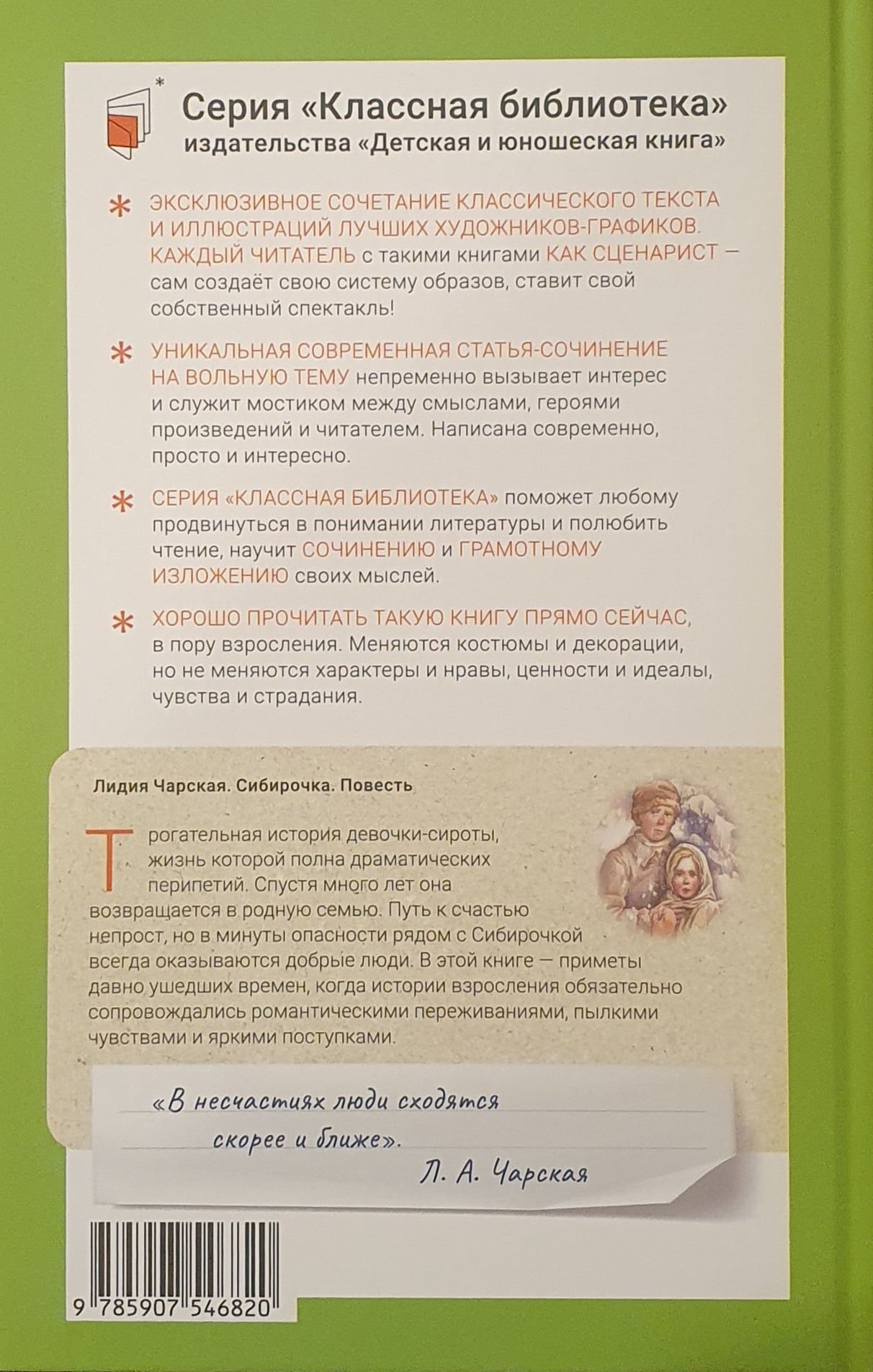 Л. А. Чарская (1875–1937) – сейчас мало кто знает этого автора и сложно поверить, что в дореволюционной России она была самым известным детским писателем, кумиром девочек всех возрастов – ее популярность была сопоставима с популярностью писателей-классиков. Целью своего творчества Лидия Чарская видела нравственное воспитание. Ее произведения развивали у молодых читателей душевные качества, побуждали к добру и состраданию – вечным ценностям, не потерявшим актуальности и в наши дни. Повесть «Сибирочка» – история маленькой девочки. Рожденная в богатой семье она в силу обстоятельств проживает детство сиротки Сибирочки, полное лишений и несправедливости.