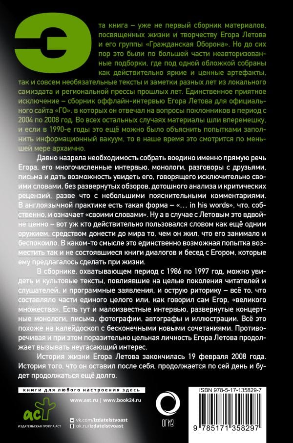 Алексей Коблов – журналист, музыкальный критик, очевидец и свидетель невероятного, один из апостолов отечественной контркультуры. Сотрудничал с изданиями «Зомби», «Урлайт», «Контр Культ Ур’а», Fuzz, Rolling Stone, «МК», «АиФ» и многими другими. Занимался организацией концертов и фестивалей с участием многих ярких представителей русскоязычного рок-н-ролла, став не только наблюдателем, но и частью истории русского Вудстока. «Давно назрела необходимость собрать воедино именно прямую речь Егора, его многочисленные интервью, монологи, разговоры с друзьями, письма и дать возможность увидеть его, говорящего исключительно своими словами, без развернутых обзоров, дотошного анализа и критических рецензий, разве что с небольшими пояснительными комментариями. В англоязычной практике есть такая форма — «… in his words», что, собственно, и означает: «своими словами». Ну а в случае с Летовым это вдвойне ценно — вот уж кто действительно пользовался словом как ещё одним оружием, средством донести до мира то, чем он жил, что его занимало и беспокоило. В каком-то смысле это единственно возможная попытка возместить так и не состоявшиеся книги диалогов и бесед с Егором, которые ему предлагалось сделать при жизни. В сборнике, охватывающем период с 1986 по 1997 год, можно увидеть и культовые тексты, повлиявшие на целые поколения читателей и слушателей, и программные заявления, и острую риторику, — всё то, что составляло части единого целого или, как говорил сам Егор, «великого множества». Есть тут и малоизвестные интервью, развернутые концертные монологи, письма, фотографии, автографы и иллюстрации. Всё это похоже на калейдоскоп с бесконечными новыми сочетаниями. Противоречивая и при этом поразительно цельная личность Егора Летова продолжает вызывать неугасающий интерес». Алексей Коблов