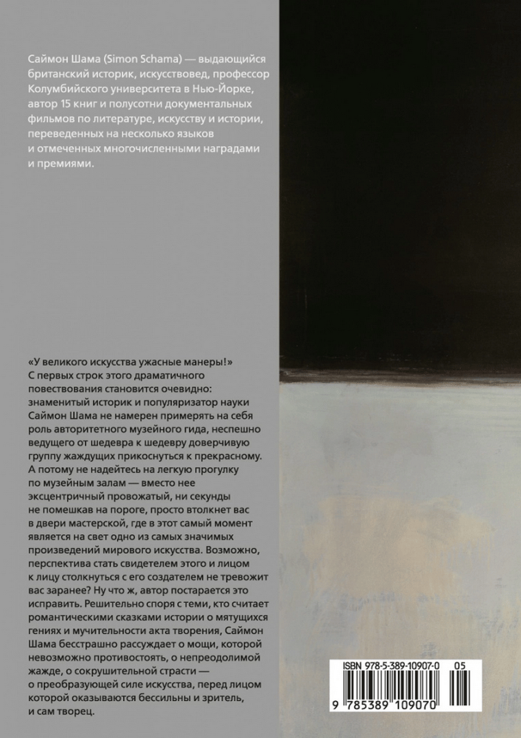 «У великого искусства ужасные манеры!» С первых строк этого драматичного повествования становится очевидно: знаменитый историк и популяризатор науки Саймон Шама не намерен примерять на себя роль авторитетного музейного гида, неспешно ведущего от шедевра к шедевру доверчивую группу жаждущих прикоснуться к прекрасному. А потому не надейтесь на легкую прогулку по музейным залам — вместо нее эксцентричный провожатый, ни секунды не помешкав на пороге, просто втолкнет вас в двери мастерской, где в этот самый момент является на свет одно из самых значимых произведений искусства. Возможно, перспектива стать свидетелем этого и лицом к лицу столкнуться с его создателем не тревожит вас заранее? Ну что ж, автор постарается это исправить. Решительно споря с теми, кто считает романтическими сказками истории о мятущихся гениях и мучительности акта творения, Саймон Шама бесстрашно рассуждает о мощи, которой невозможно противостоять, о непреодолимой жажде, о сокрушительной страсти — о преобразующей силе искусства, перед лицом которой оказываются бессильны и зритель, и сам творец.