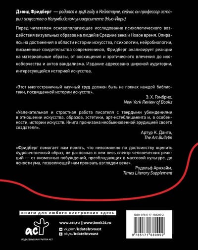 Перед читателем основополагающее исследование психологического воздействия визуальных образов на людей в Средние века и Новое время. Опираясь на достижения в области истории искусства, психологии, нейробиологии, письменные свидетельства современников, Фридберг анализирует реакци на материальные образы, от восхищения и эротического влечения до иконоборчества и актов вандализма. Издание адресовано широкой аудитории, интересующейся историей искусства.