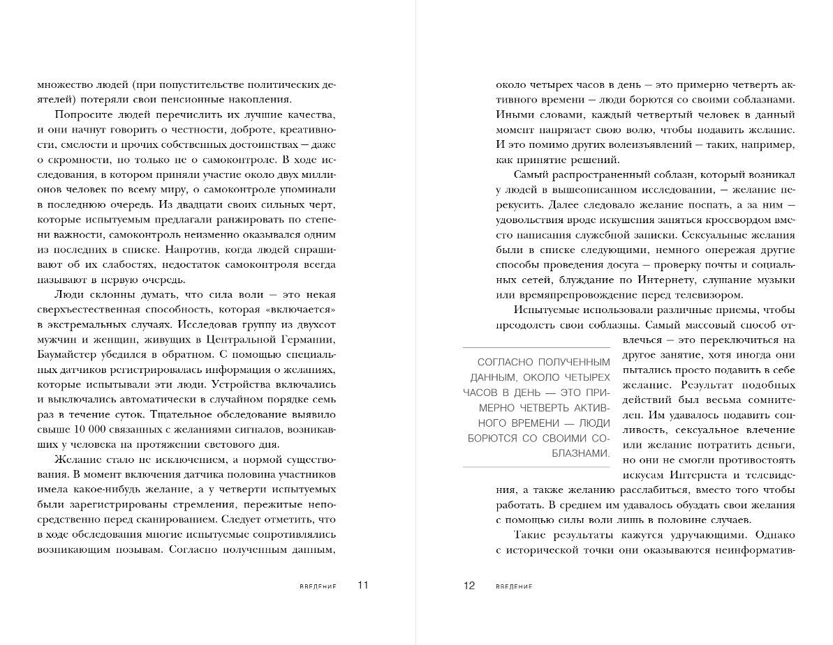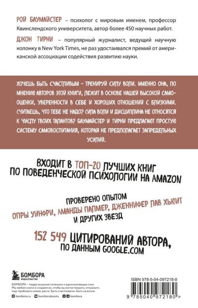 Понимая это, два блистательных ума, Рой Ф. Баумайстер и Джон Тирни, предлагают читателям простую систему самовоспитания. Она бесконечно реалистична и базируется на физиологических особенностях человеческого организма. Так, например, авторы увязывают проявления силы воли с тем, какие решения приходилось принимать накануне, с содержанием уровня глюкозы в крови, с гормональными процессами в организме. Подход Баумайстера и Тирни — редкий случай, когда проблему предлагается решать не в лоб, а используя обходные, зачастую куда более короткие, чем основной, пути.