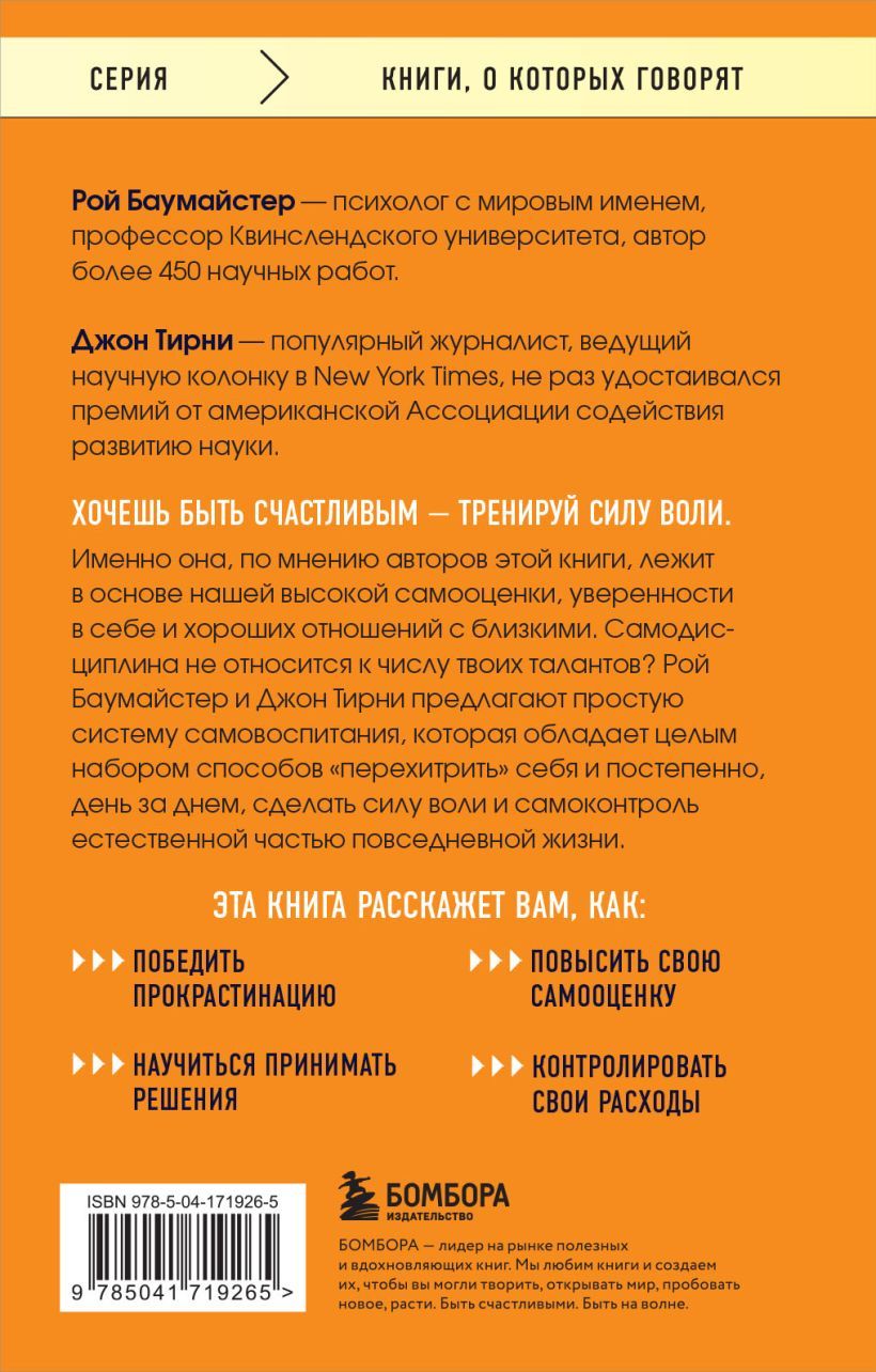 Понимая это, два блистательных ума, Рой Ф. Баумайстер и Джон Тирни, предлагают читателям простую систему самовоспитания. Она бесконечно реалистична и базируется на физиологических особенностях человеческого организма. Так, например, авторы увязывают проявления силы воли с тем, какие решения приходилось принимать накануне, с содержанием уровня глюкозы в крови, с гормональными процессами в организме. Подход Баумайстера и Тирни — редкий случай, когда проблему предлагается решать не в лоб, а используя обходные, зачастую куда более короткие, чем основной, пути.