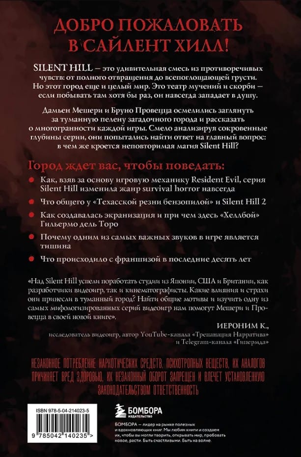 Дамьен Мешери и Бруно Провецца осмелились заглянуть за туманную пелену загадочного города и рассказать о многогранности каждой игры. Смело анализируя сокровенные глубины серии, они попытались найти ответ на главный вопрос: в чем же кроется неповторимая магия Silent Hill?