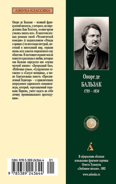 Оноре де Бальзак — великий французский писатель, у которого, по определению Льва Толстого, «в оное время учились писать все». В многочисленных романах своей «Человеческой комедии» (с подзаголовком «Этюды о нравах») он воссоздал пестрый, жестокий и многоликий мир, отразив жизнь всех классов современного ему общества.