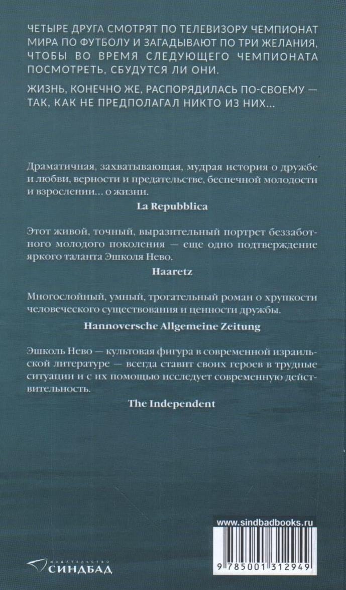 Четверо неразлучных друзей смотрят по телевизору финальный матч чемпионата мира по футболу. Игра близится к завершению, когда одному из них приходит в голову неожиданная идея: они загадают по три желания, а ровно через четыре года, во время финала следующего чемпионата, они достанут свои записки и посмотрят, что из загаданного сбылось, а что нет. Эта книга о том, что происходило дальше с их желаниями, их дружбой, их жизнью.