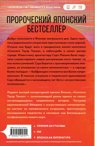 Лауреат высшей литературной премии Японии «Симпати Тауэр Токио»— захватывающий роман одного из самых экстраординарных современных авторов. Частично вдохновленный беседами с искусственным интеллектом, он состоит из человеческого остроумия, трогательного исследования творчества и насмешки над беспощадным конформизмом нашего мира.