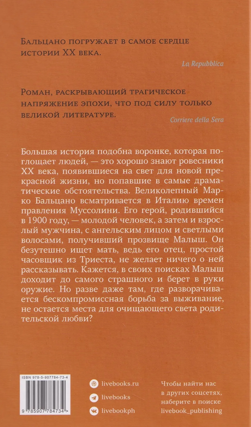 Большая история подобна воронке, которая поглощает людей, — это хорошо знают ровесники ХХ века, появившиеся на свет для новой прекрасной жизни, но попавшие в самые драматические обстоятельства. Великолепный Марко Бальцано всматривается в Италию времен правления Муссолини. Его герой, родившийся в 1900 году — молодой человек, а затем и взрослый мужчина, с ангельским лицом и светлыми волосами, получивший прозвище Малыш. Он безутешно ищет мать, ведь его отец, простой часовщик из Триеста, не желает ничего о ней рассказывать. Кажется, в своих поисках Малыш доходит до самого страшного и берёт в руки оружие. Но разве даже там, где разворачивается бескомпромиссная борьба за выживание, не остается места для очищающего света родительской любви?