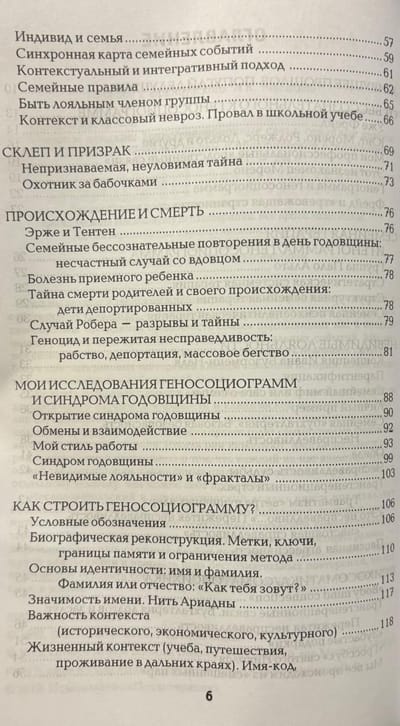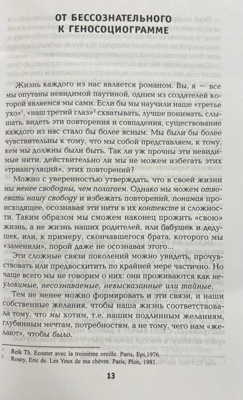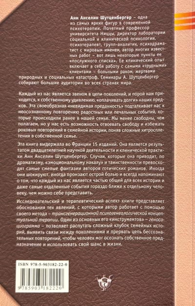 Все мы являемся звеньями в цепи поколений, и порой нам приходится, к собственному удивлению, «оплачивать долги» прошлого наших предков. Эта своеобразная «невидимая преданность семье» подталкивает нас к неосознанному повторению приятных ситуаций или печальных событий. Мы менее свободны, чем полагаем, но у нас есть возможность отвоевать свою свободу и избежать роковых повторений в нашей семейной истории, поняв сложные хитросплетения в собственной семье. Эта книга во Франции выдержала 15 изданий. Она является результатом двадцатилетней научной деятельности и клинической практики Анн Анселин Шутценбергер. Случаи, которые она приводит, по драматизму, «эмоциональному градусу» и таинственности превосходит самые смелые фантазии авторов готических романов. Иногда они шокируют, иногда пронзают острой болью и всегда напоминают о том, что каждый из нас является частью общей для всех истории и даже самые отдаленные события гораздо ближе к отдельному человеку, чем можно себе представить. Исследовательский и терапевтический аспект книги представляет обоснования тех явлений, с которыми автор работает с помощью своего метода — трансгенерационной психогенеалогической контекстуальной терапии. Один из основных его «инструментов» — геносоциограммы — позволяет распутать сложный клубок семейных историй, выявить связи между поколениями и прервать цепь бессознательных повторений, чтобы человек мог осознать собственное предназначение и использовать свой шанс в жизни.