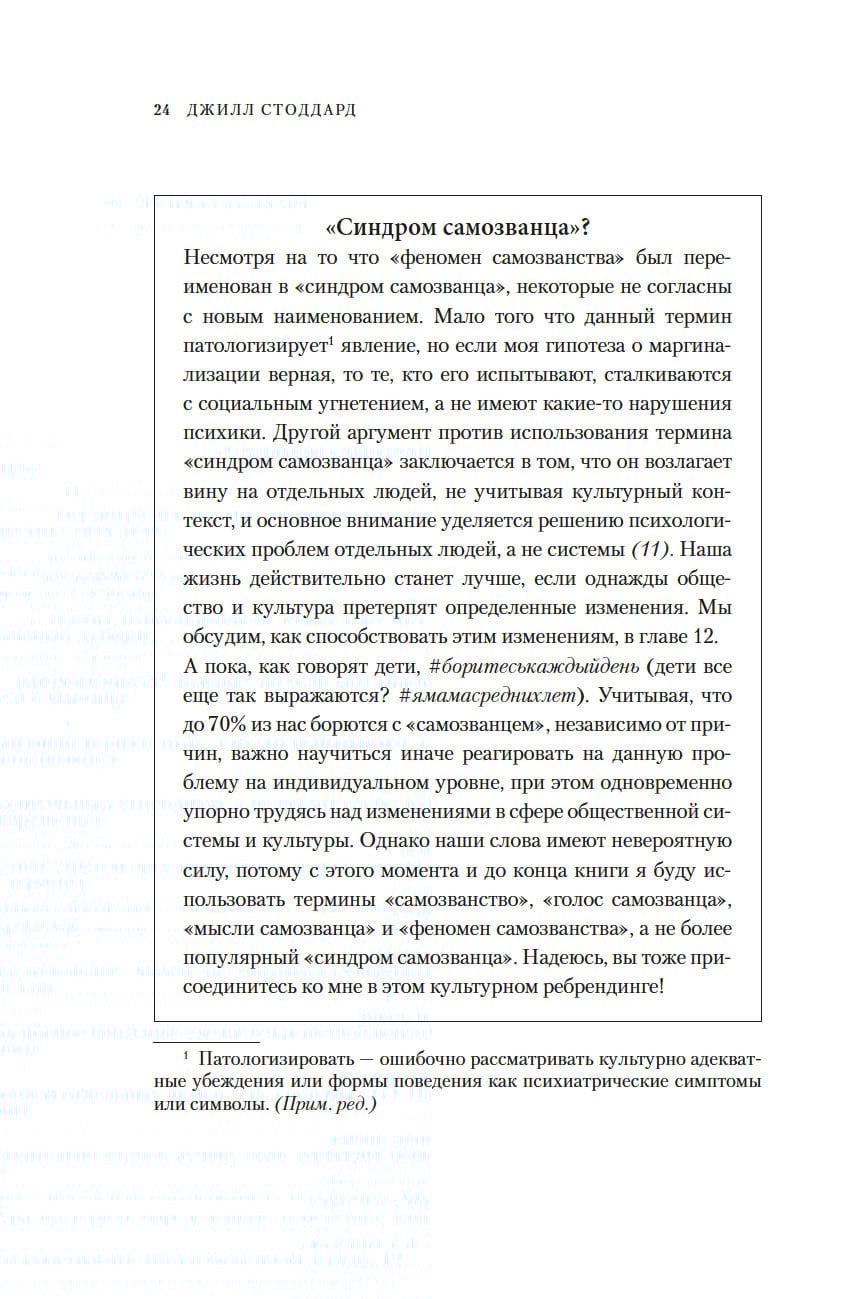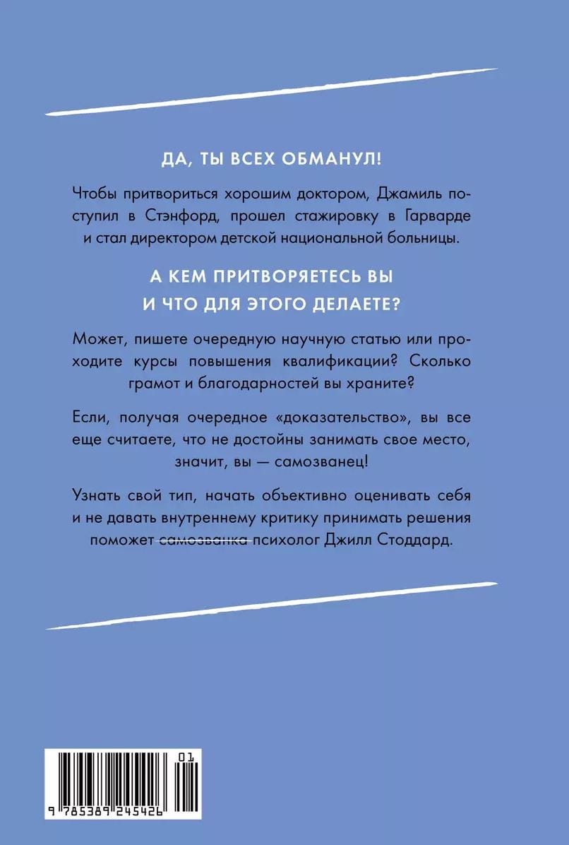 Поэтому Джилл Стоддард дает подробное объяснение «феномену самозванства» и его типажам, а также предлагает несколько действенных методик, которые позволят: распознать голос самозванца; принимать решения, даже если они пугают; перестать жалеть себя; отказаться от жизни на автопилоте. и научиться бороться за свои ценности; начать жить полной жизнью.