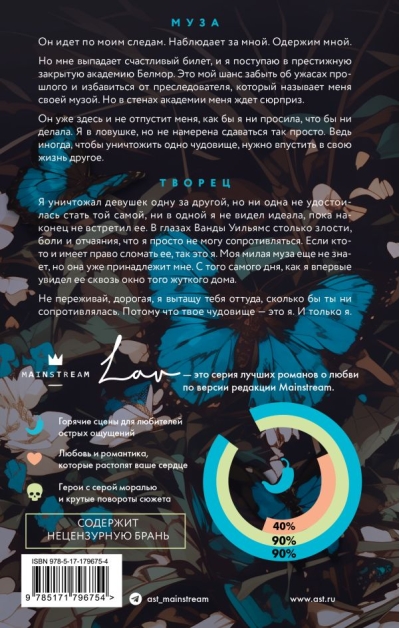 Он идет по моим следам. Наблюдает за мной. Одержим мной. Но мне выпадает счастливый билет, и я поступаю в престижную закрытую академию Белмор. Это мой шанс забыть об ужасах прошлого и избавиться от преследователя, который называет меня своей музой. Но в стенах академии меня ждет сюрприз.