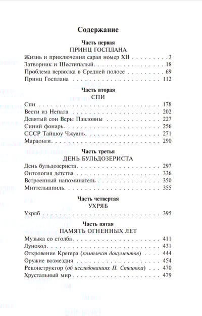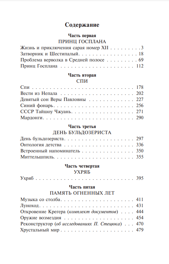 В сборник вошли повести «‎Затворник и Шестипалый»‎, «‎Принц Госплана»‎, а также рассказы «‎День бульдозериста»‎, «‎Девятый сон Веры Павловны»‎, «‎Жизнь и приключения сарая номер XII»‎.