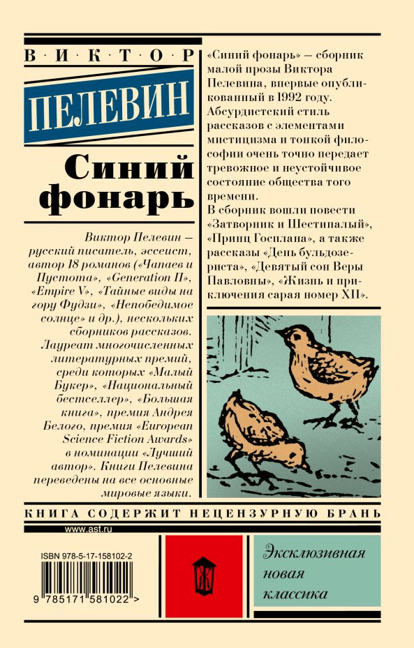 «‎Синий фонарь»‎ – сборник малой прозы Виктора Пелевина, впервые опубликованный в 1992 году. Абсурдистский стиль рассказов с элементами мистицизма и тонкой философии очень точно передает тревожное и неустойчивое состояние общества того времени.